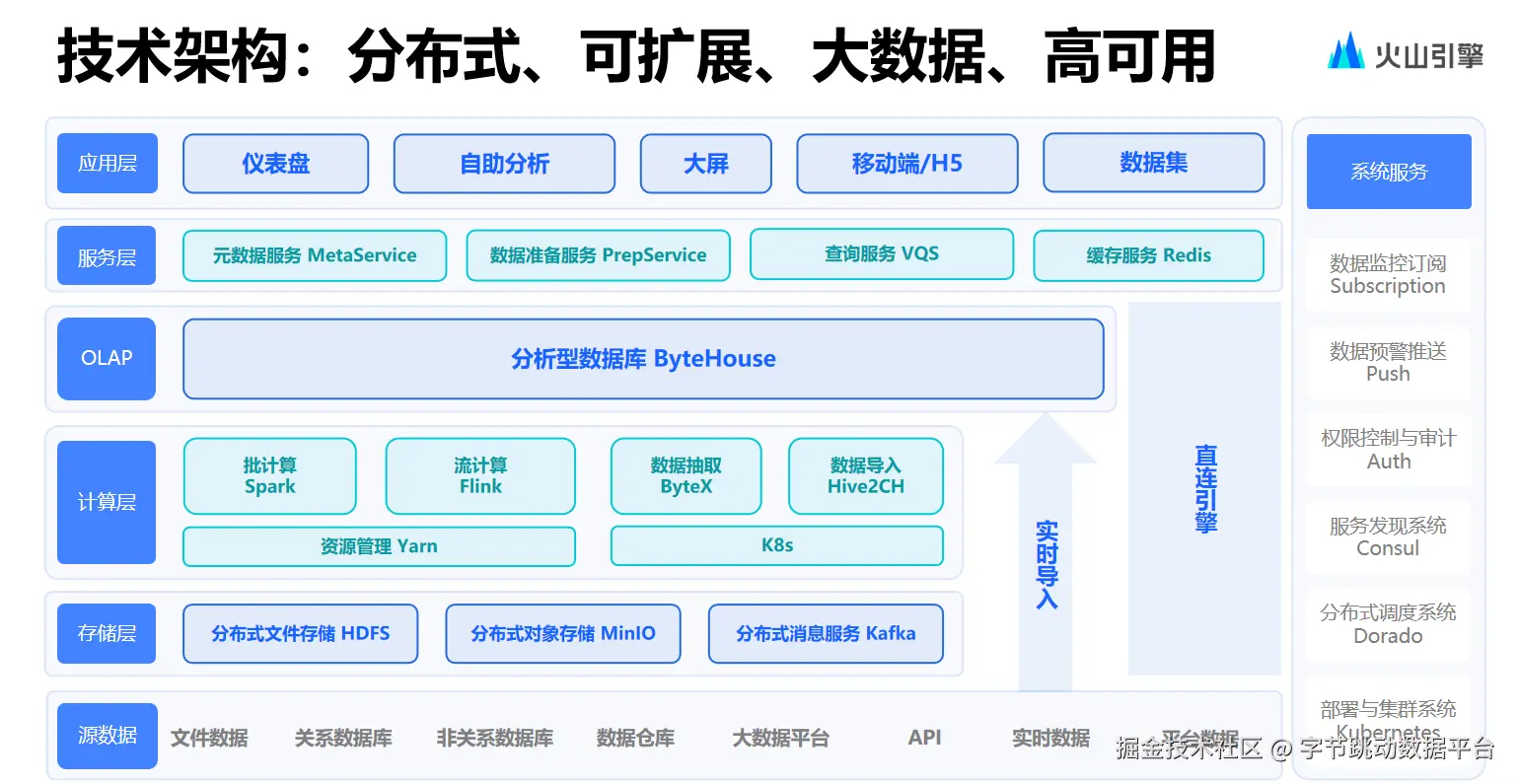 为了满足用户对性能的需求,开发中采取了有别于主流 BI 厂商的思路。虽然 DataWind 产品支持直连目前通用的大部分数据源、数据引擎与数据库。但在企业内部用户更多地使用“抽取”,即围绕自研分析性数据库 ByteHouse 建设了非常重的抽取链路,把公司内几乎全部需要进行数据分析的数据全部放入 ByteHouse 中。