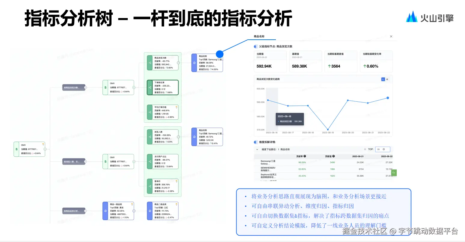 在集团内部,大家在进行 OKR 对齐时,指标往往会形成类似指标体系的东西,即:上级重视 GMV 等指标,而下级更关注 PV 等指标,这种差异便会形成树状指标结构。如果对于指标存在疑问,就会进行固化的基于维度的分析,其总体思路是将指标分析过程进行固化,确保在查看 OKR 或指标时,能够清楚知道出现异常的板块、维度和节点。
