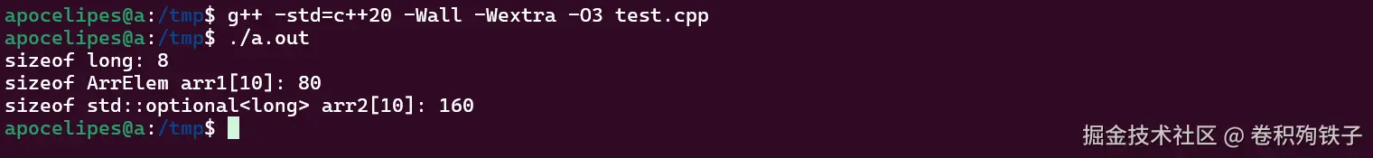 std::cout << "sizeof std::optional<long> arr2[10]: " << sizeof(arr2) << '\n';