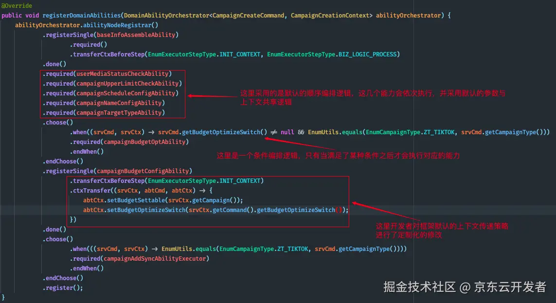 上文提到了能力编排和路由机制都已经在新工程中提供了框架化的实现,本文主要是为了分享我们架构设计的动机,所以不会介绍这些功能的实现原理和使用方法,对此感兴趣的同学可以观看能力编排框架专门的视频教程:cf.jd.com/pages/viewp…