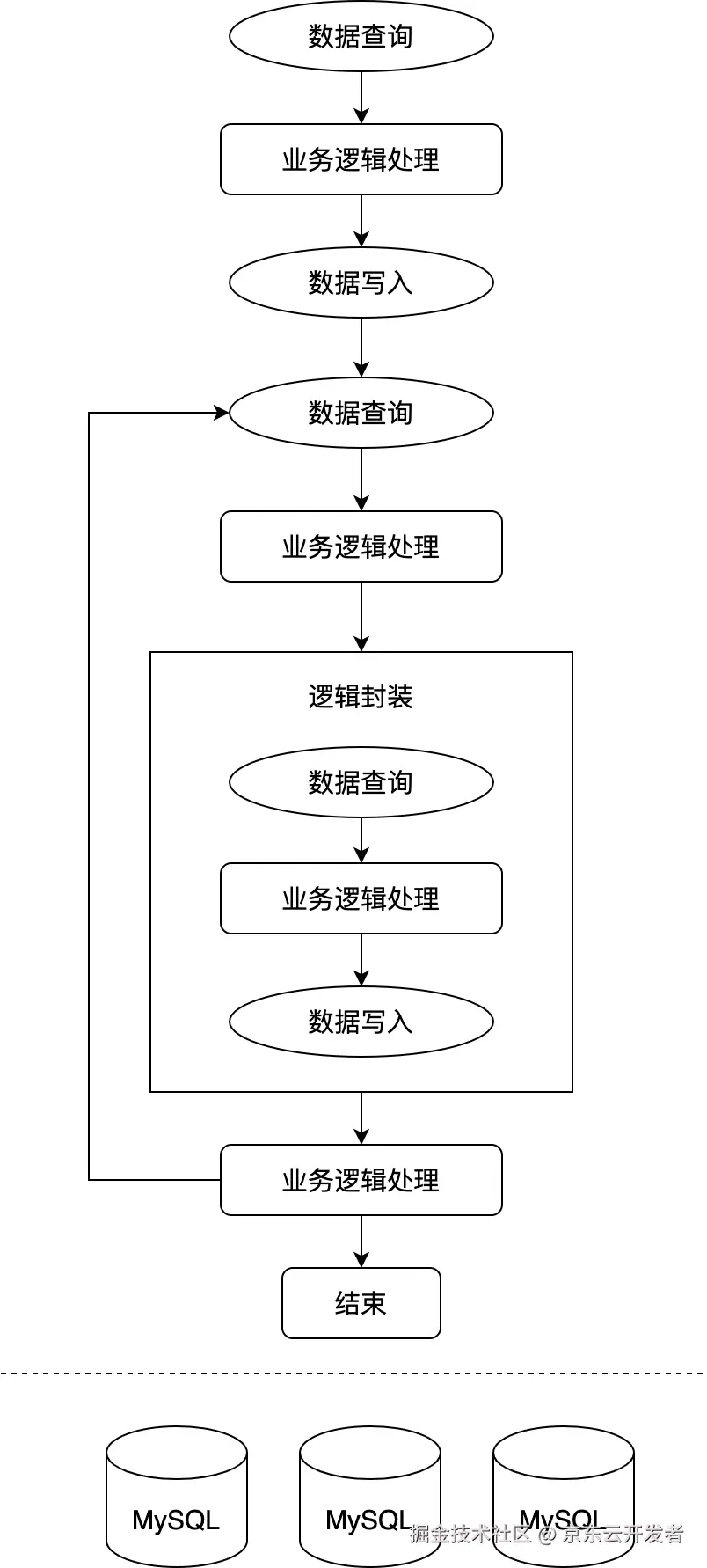 最开始的时候我们的架构如下图所示,这也是我们目前最常见一种代码架构。可以看出它的特点就是“简单”,没有过多的封装和设计,平铺直叙,数据查询和业务逻辑处理互相交织,是面向数据库编程的典型案例。这种架构在早期场景单一、需求简单的阶段可以快速实现功能,没有多余的设计成本,但是随着业务的发展,系统服务的场景越来越多,这套架构就变得越来越不简单了。