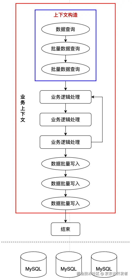 所有的数据集中在“上下文构造”步骤中查询,整个业务流程运行在上下文对象中