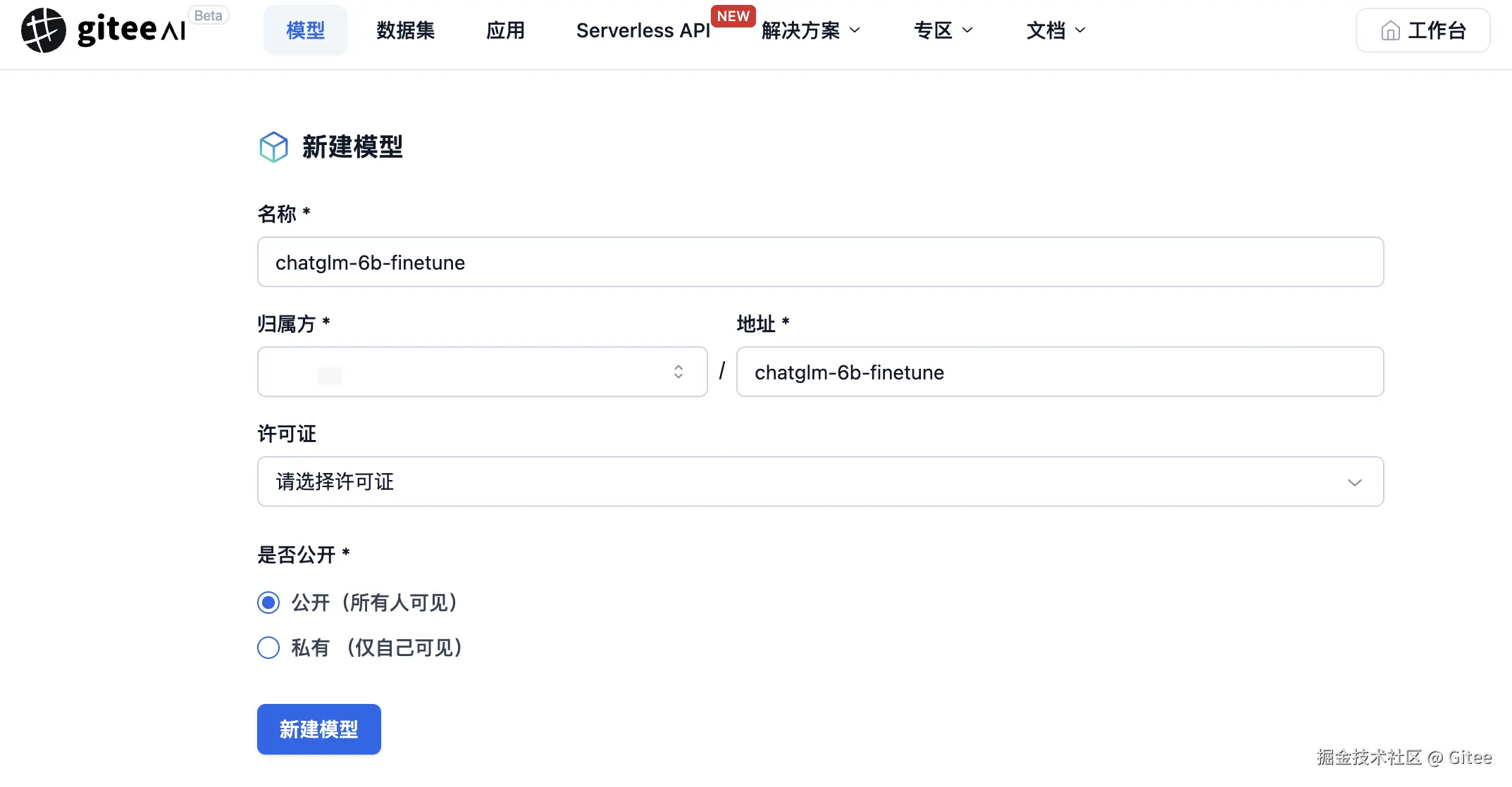 配置完成后,即可进行大模型文件的推送操作了。点击页面右上角头像,选择新建模型即可在 Gitee AI 创建新的模型仓库。