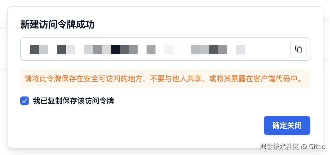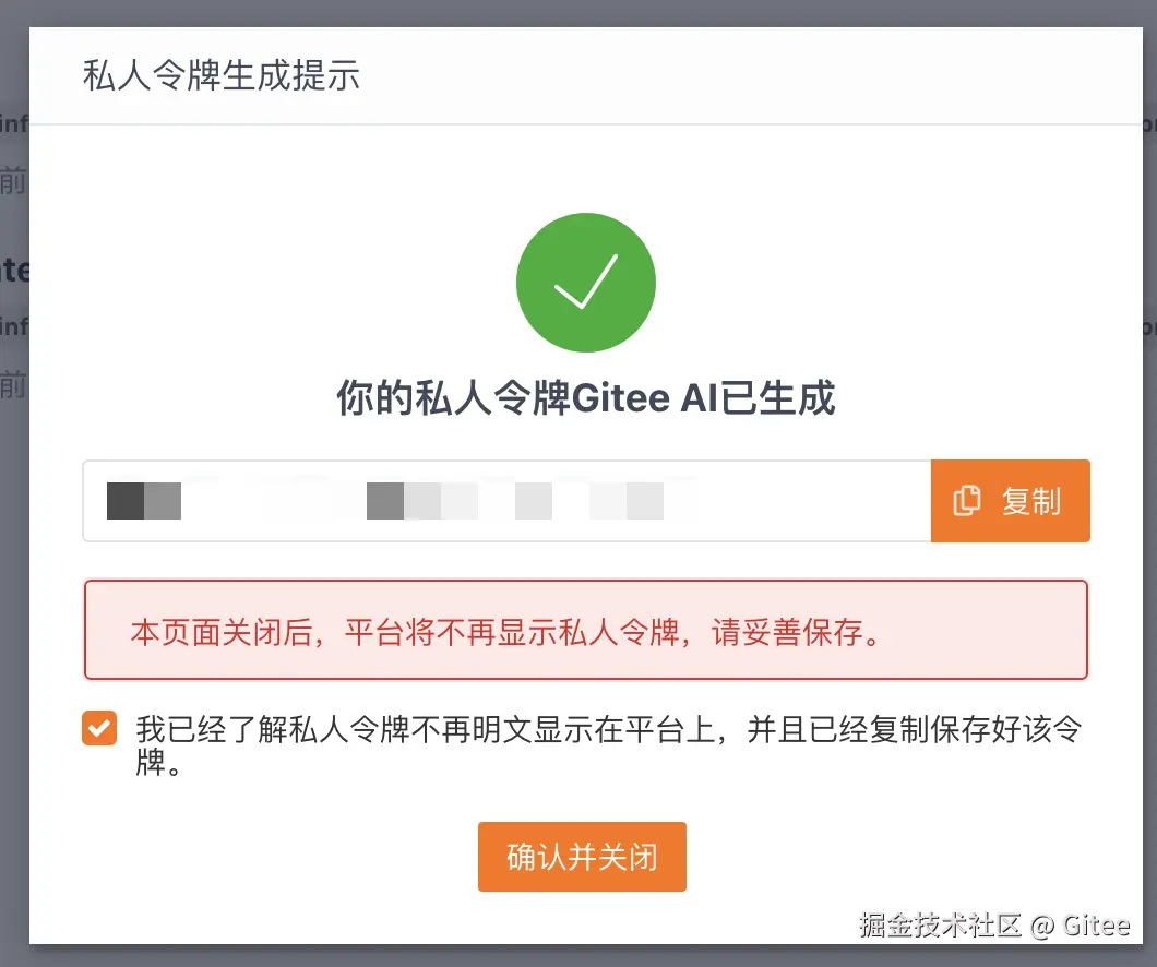 与 Gitee 私人令牌相同,请将生成的令牌复制并妥善保存。