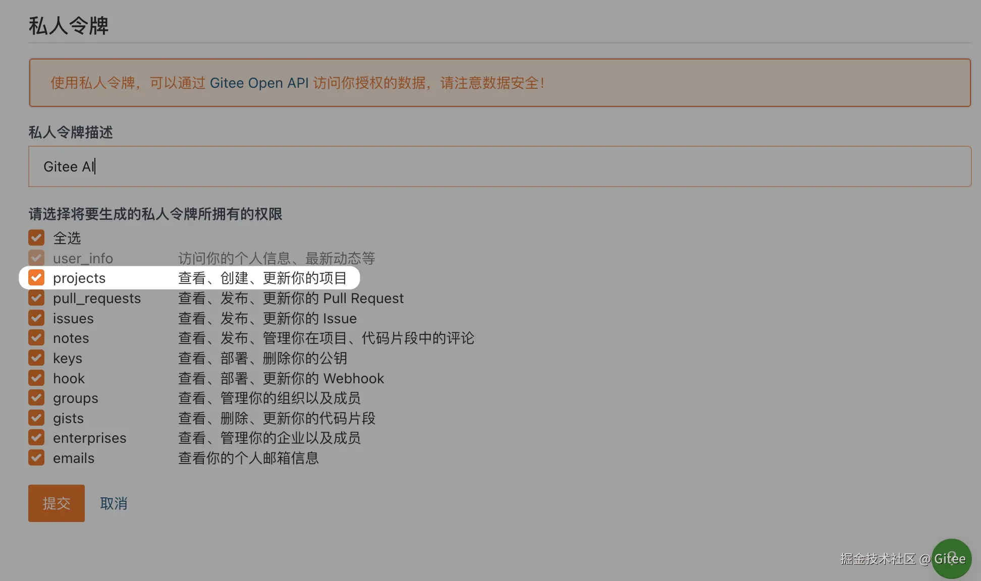 创建令牌时需勾选 projects 权限。