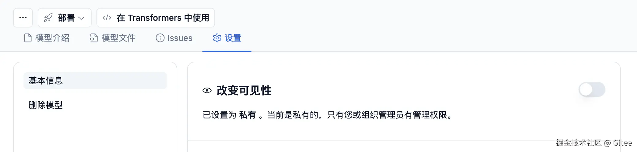 推送完成后,你微调后的模型就可以在 Gitee AI 中访问了,你可以在仓库设置中更改其可见性,选择将其开源或私有。