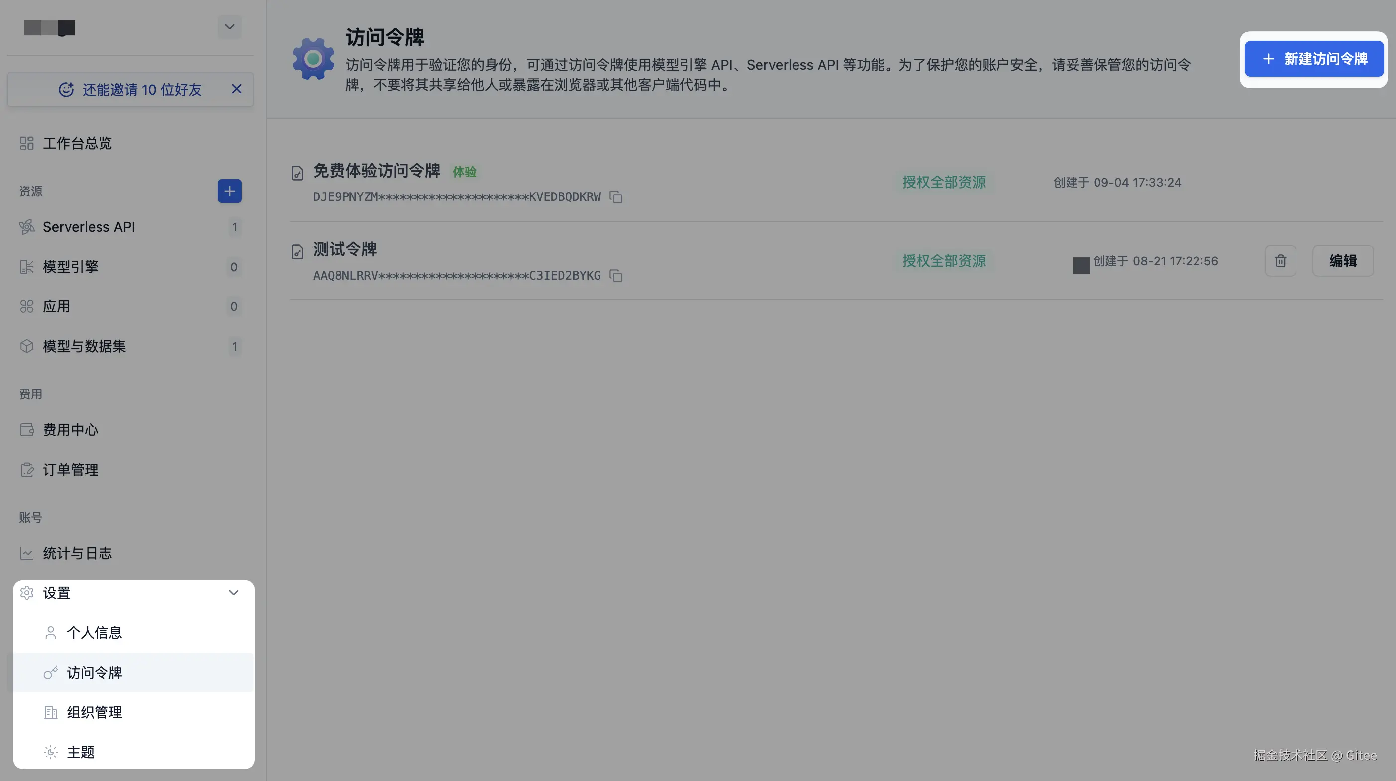 访问 ai.gitee.com,点击右上角头像选择设置-私人令牌,点击右上角新建访问令牌即可创建。