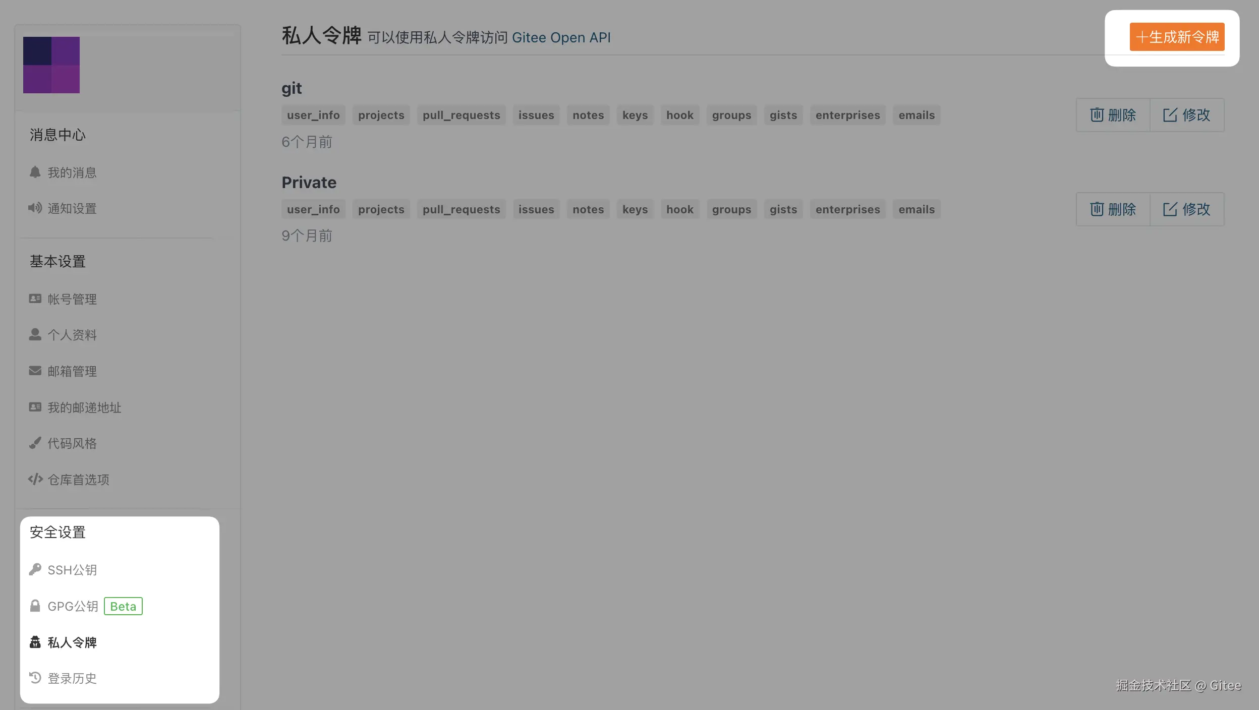 # 配置 Gitee 私人令牌