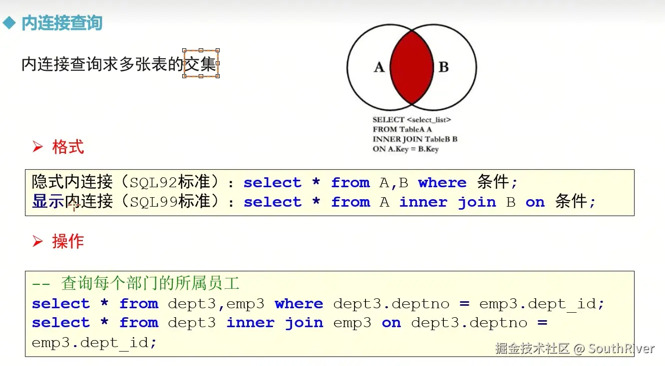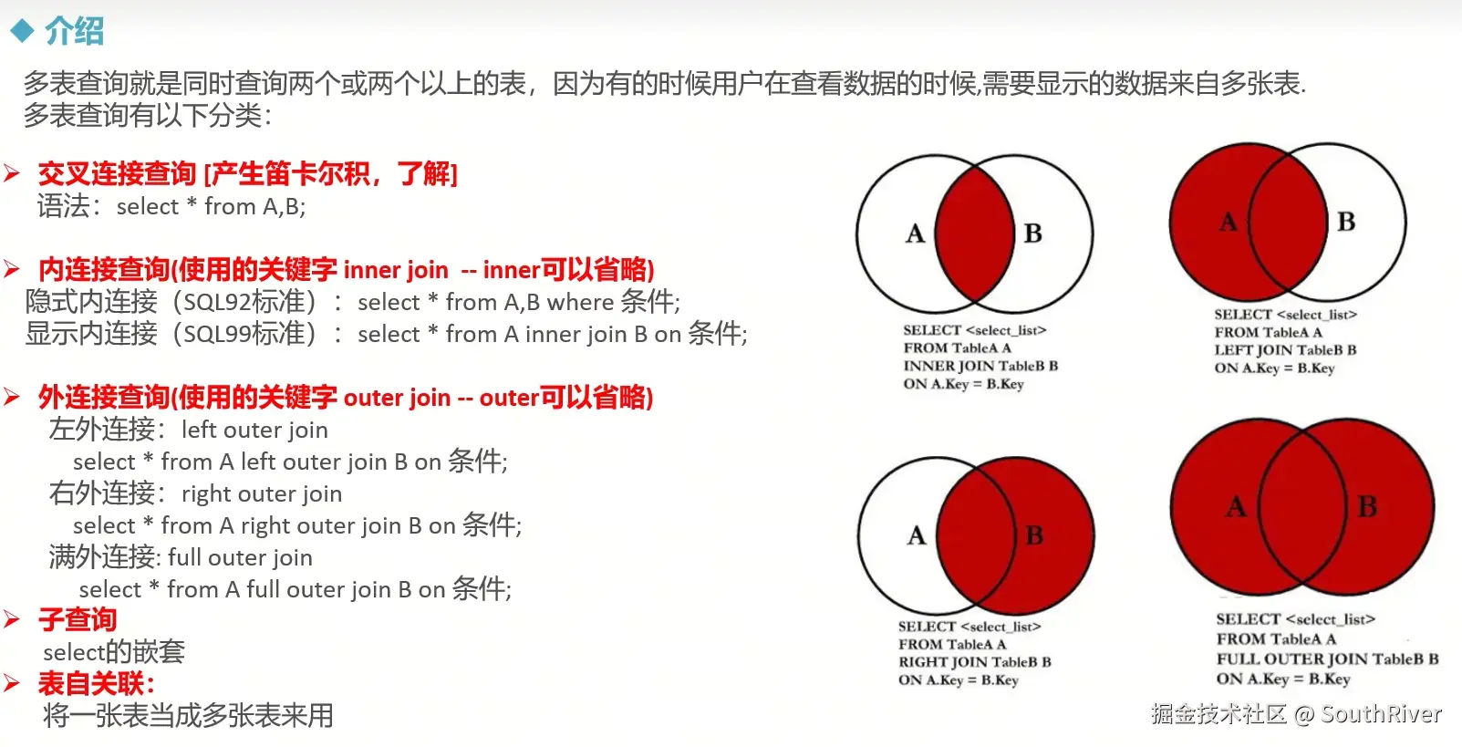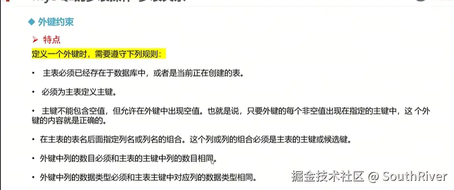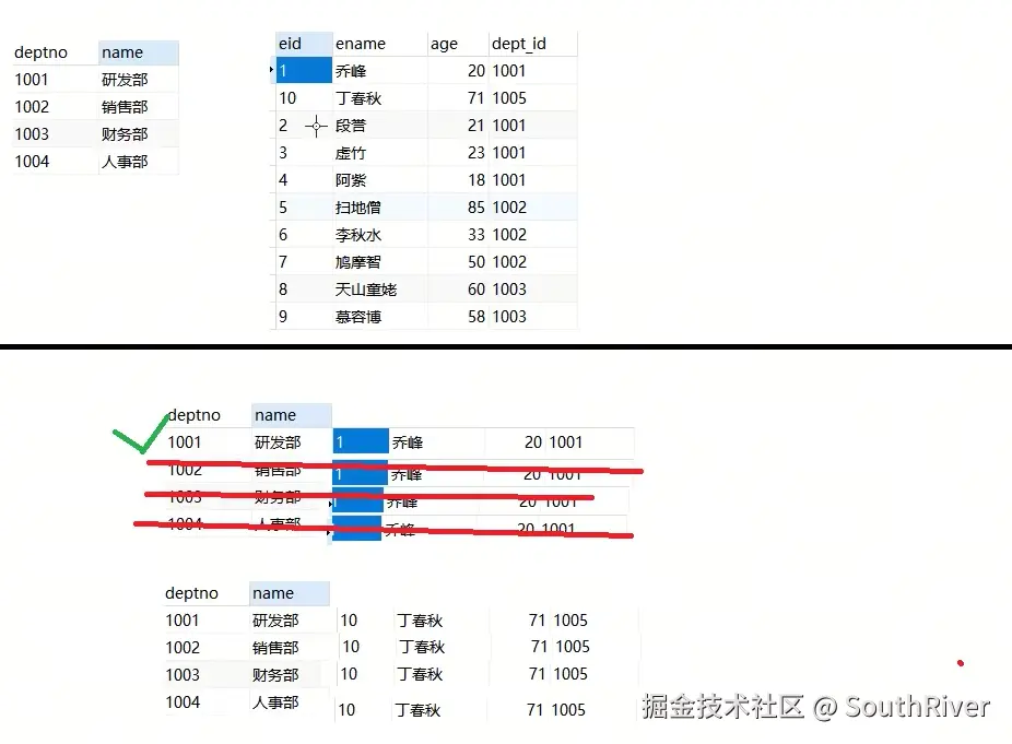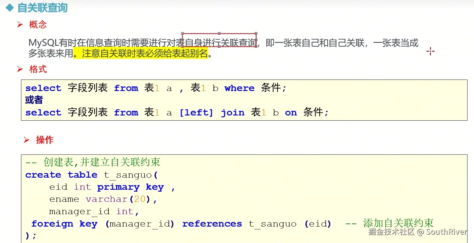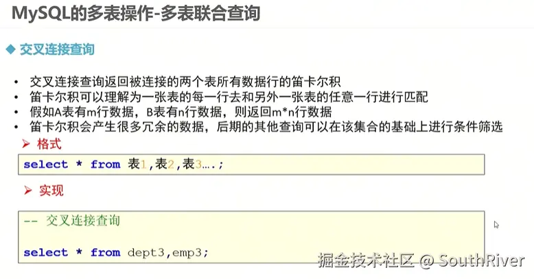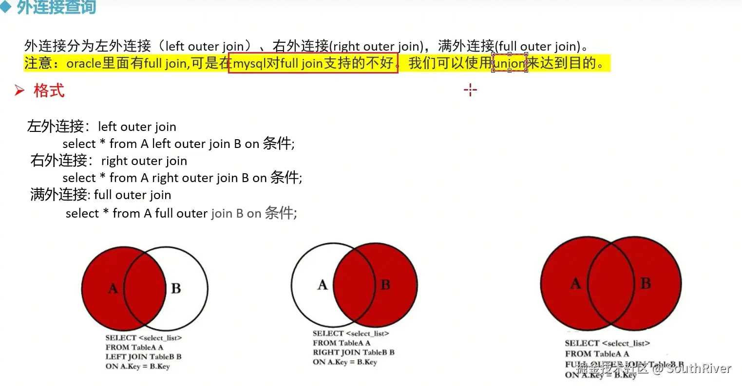 MySql学习笔记_第一篇 SouthRiver 2024-09-18 50 阅读1分钟 1. 删除表所有内容和清空表所有内容语句 delete form student truncate student 2. DQL单表查询,以及多表外键约束 3. 多表查询,内连接,外连接 3.1 内连接交集 3.2 外连接,左连接,右连接,满外连接 3.3 子查询 3.4 自关联查询 4. DQL 总结 练习