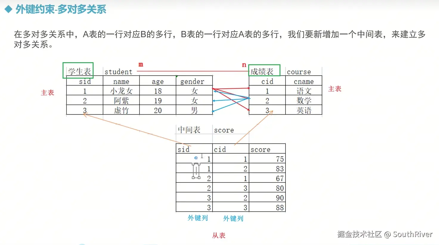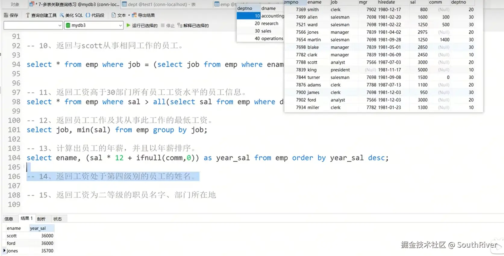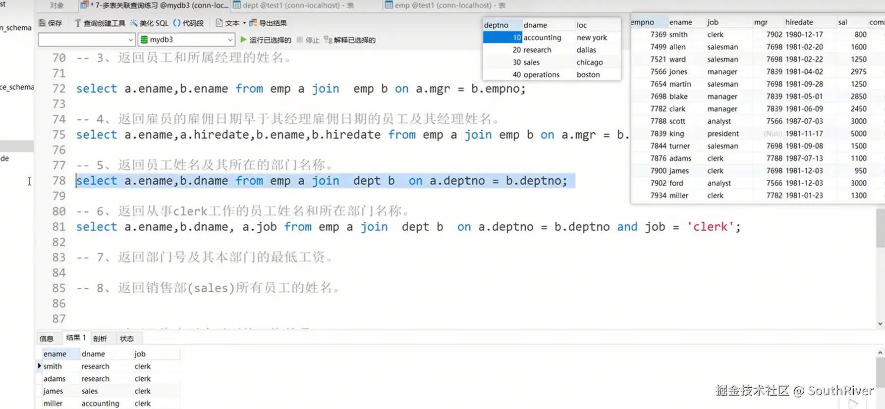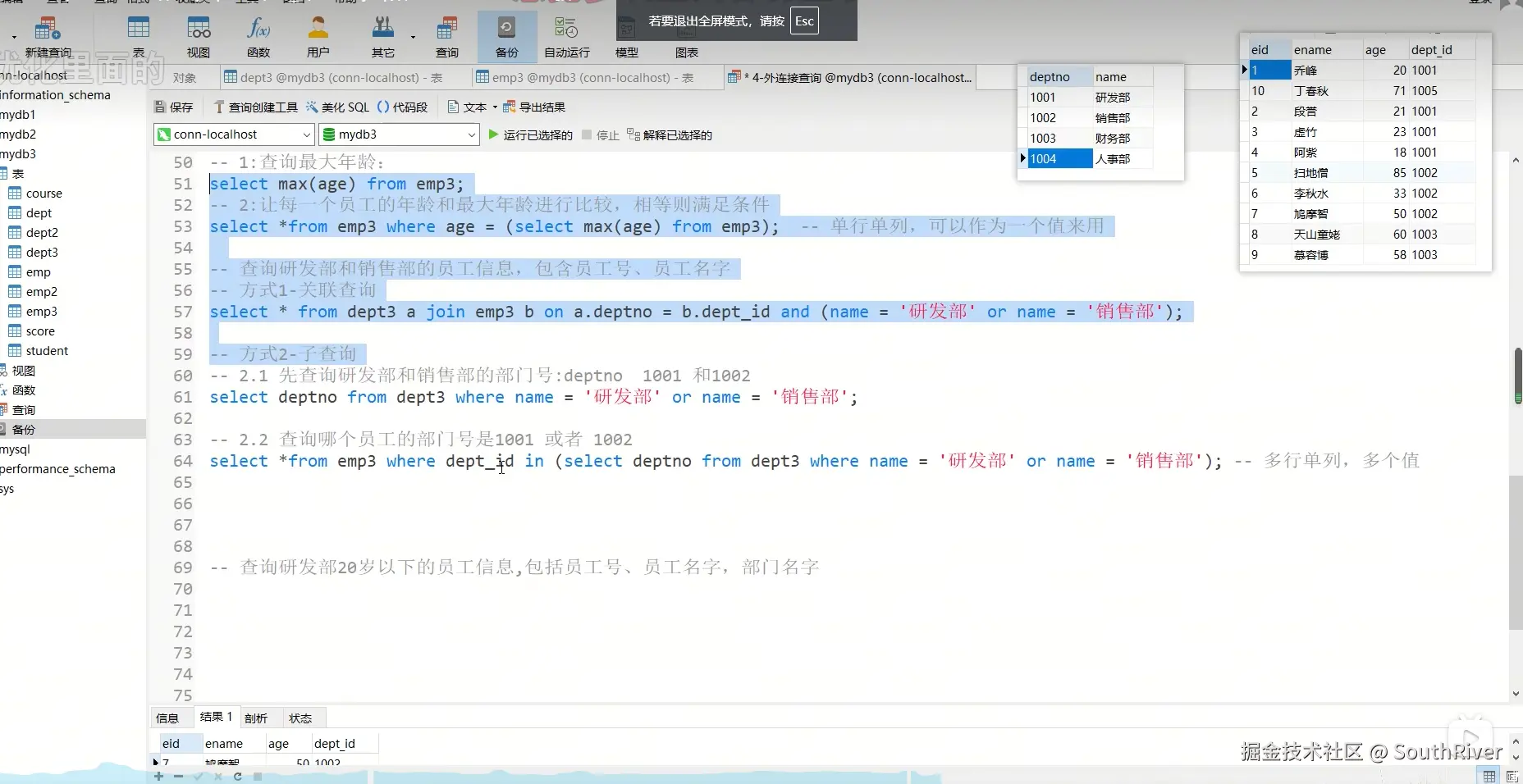 MySql学习笔记_第一篇 SouthRiver 2024-09-18 50 阅读1分钟 1. 删除表所有内容和清空表所有内容语句 delete form student truncate student 2. DQL单表查询,以及多表外键约束 3. 多表查询,内连接,外连接 3.1 内连接交集 3.2 外连接,左连接,右连接,满外连接 3.3 子查询 3.4 自关联查询 4. DQL 总结 练习