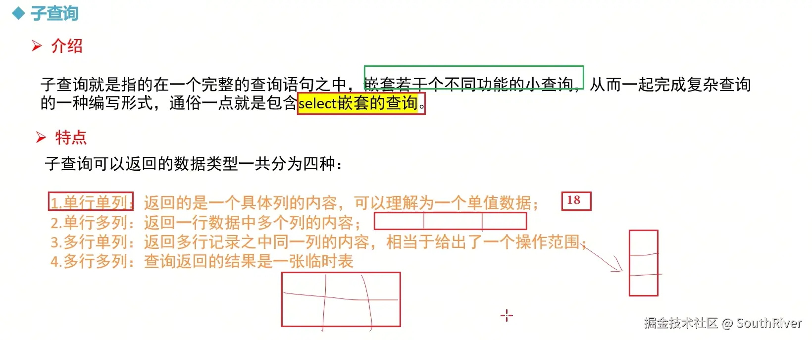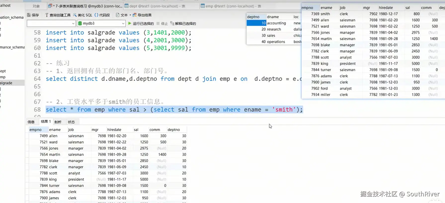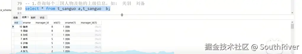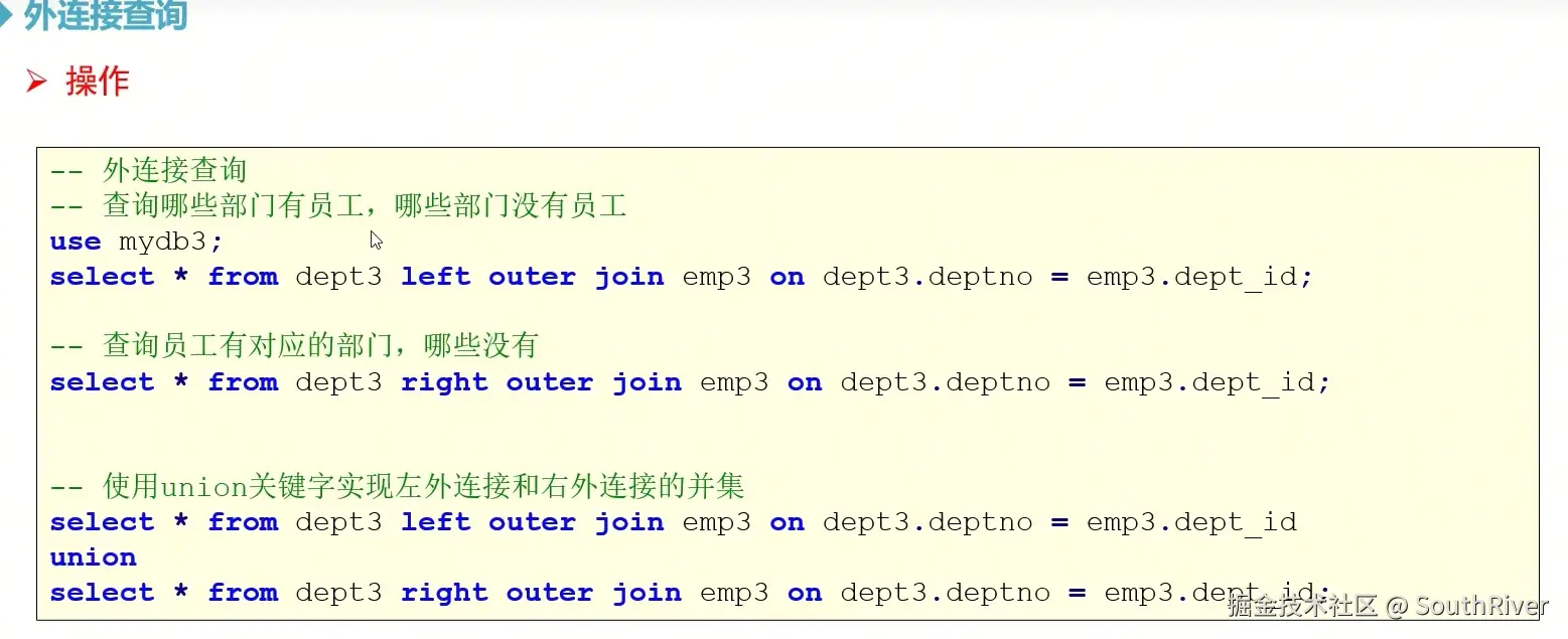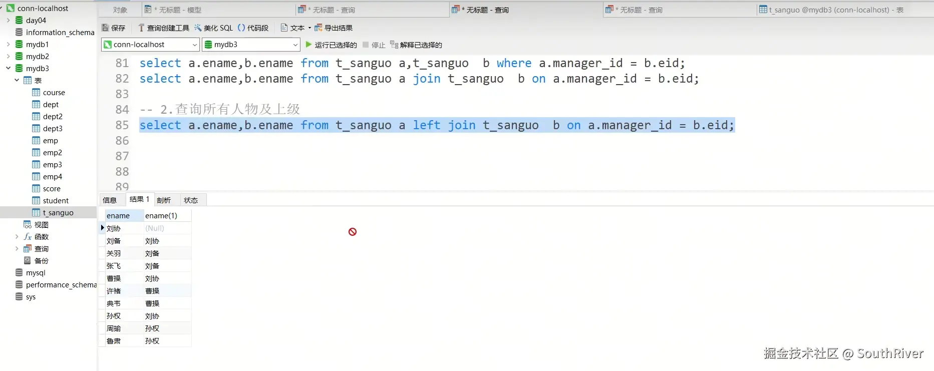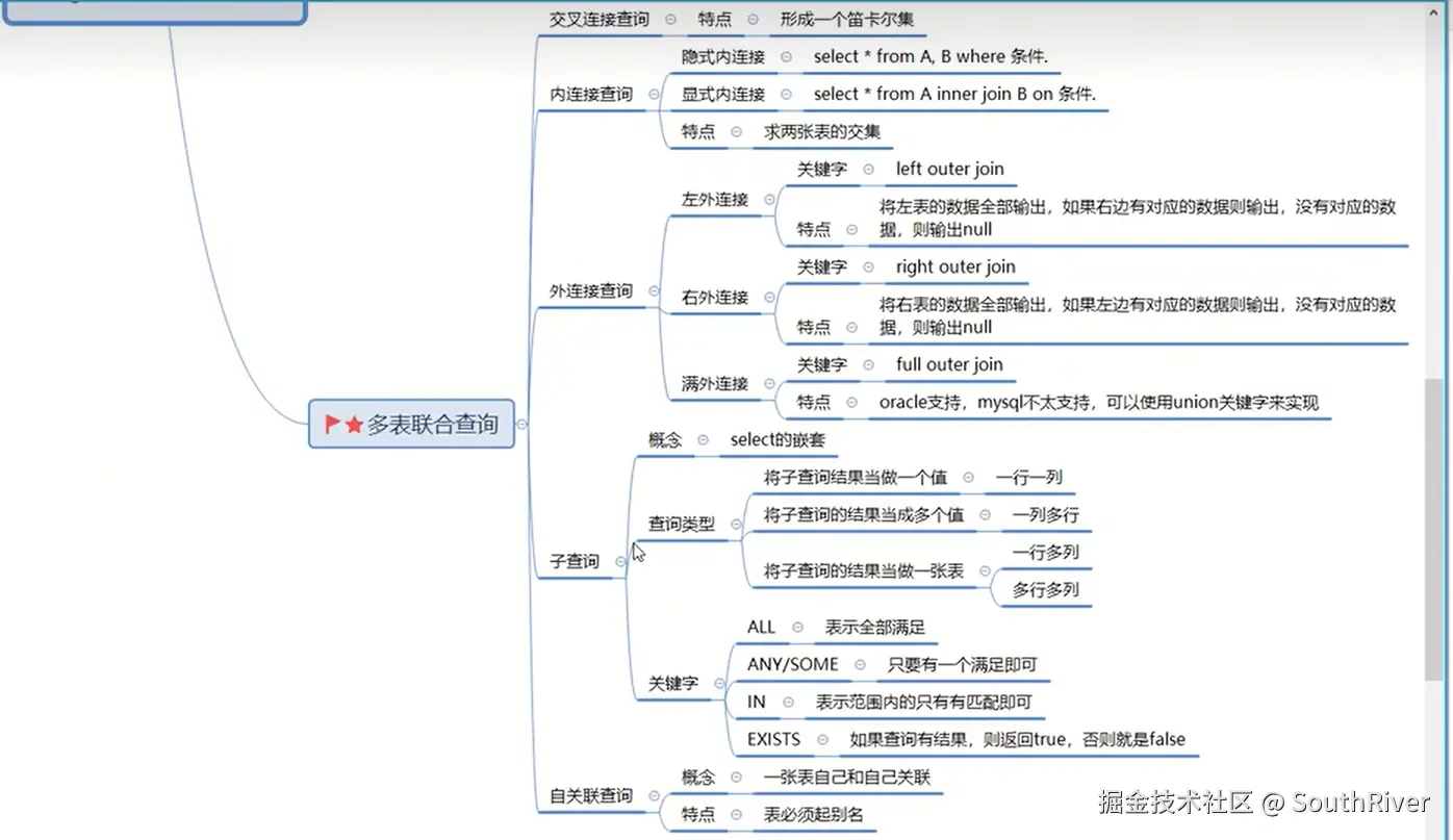 MySql学习笔记_第一篇 SouthRiver 2024-09-18 52 阅读1分钟 1. 删除表所有内容和清空表所有内容语句 delete form student truncate student 2. DQL单表查询,以及多表外键约束 3. 多表查询,内连接,外连接 3.1 内连接交集 3.2 外连接,左连接,右连接,满外连接 3.3 子查询 3.4 自关联查询 4. DQL 总结 练习