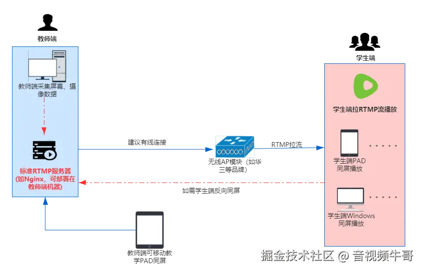 智慧教室无纸化方案在教育、企业培训、科研机构和公共服务等多个领域都得到了广泛应用,并发挥了重要作用。随着技术的不断进步和应用场景的不断拓展,其应用前景将更加广阔。其实一个好的智慧教室无纸化同屏系统,需要考虑组网、分辨率、码率、时延、音视频同步和连续性等各个指标,本文抛砖引玉,感兴趣的开发者,可以跟我单独沟通讨论。
