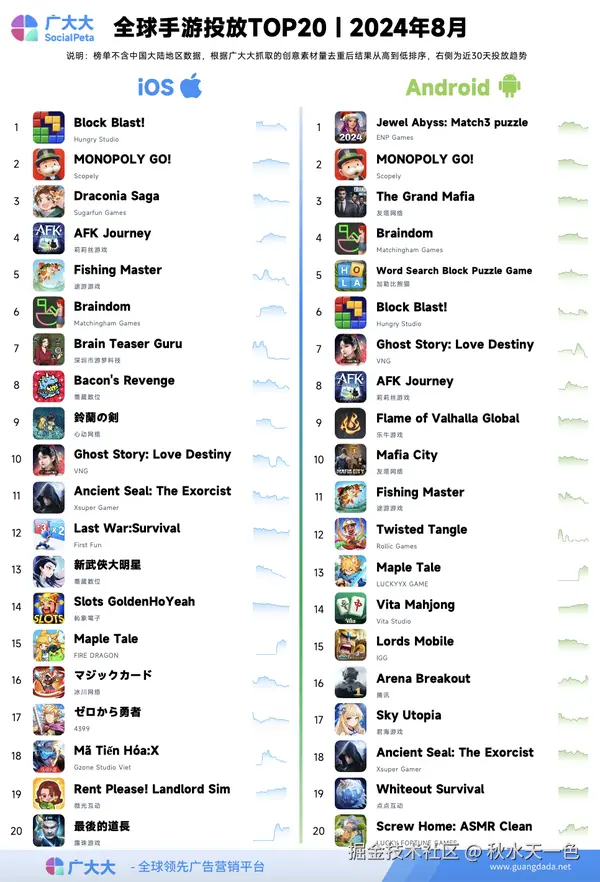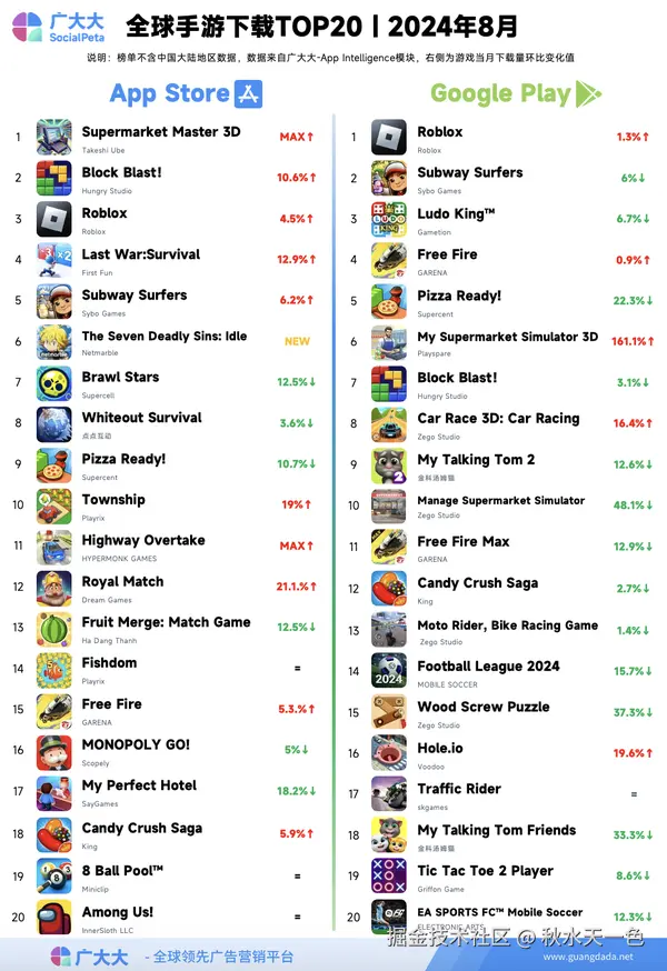根据广大大——App Intelligence等模块数据,广大大数据研究院整理并发布2024年8月全球手游投放、收入和下载TOP20榜单,帮助更多移动应用从业人员了解全球移动市场变化趋势。