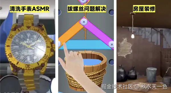 与玩法类似,【Screw Home: ASMR Clean】的买量素材也分为了三块内容,其中ASMR元素多用手表清洗素材来表现;拔螺丝玩法则叠加了休闲手游常用的问题解决+故意失败套路;房屋装修方面多用破屋改造的前后巨大反差来吸引玩家眼球。