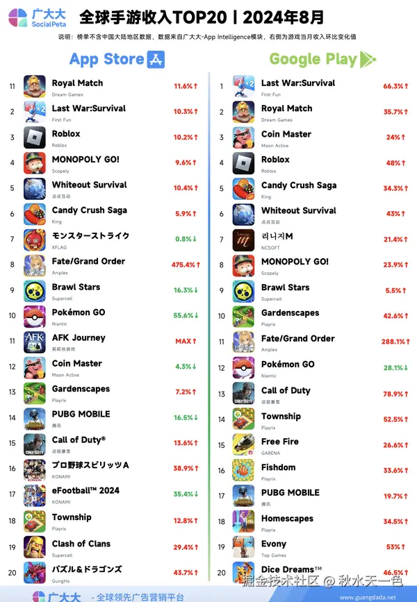 以上便是2024年8月份全球成功手游,内含投放洞察,和App Store、Google Play双商店手游收入&下载情况。