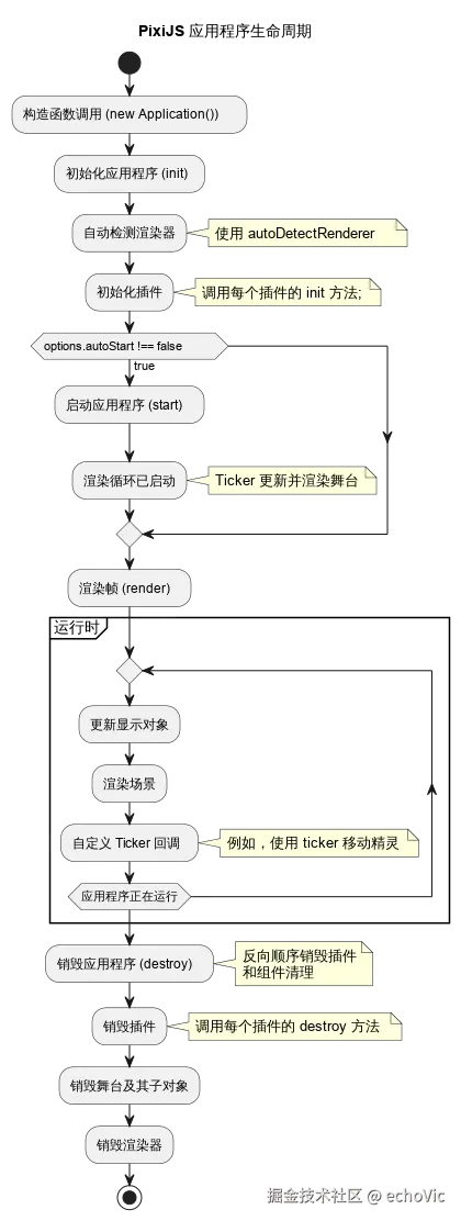 通过这些生命周期管理方法,开发者可以确保PixiJS应用程序在使用期间高效运行,并在不需要时妥善释放所有资源,保持系统的良好性能。