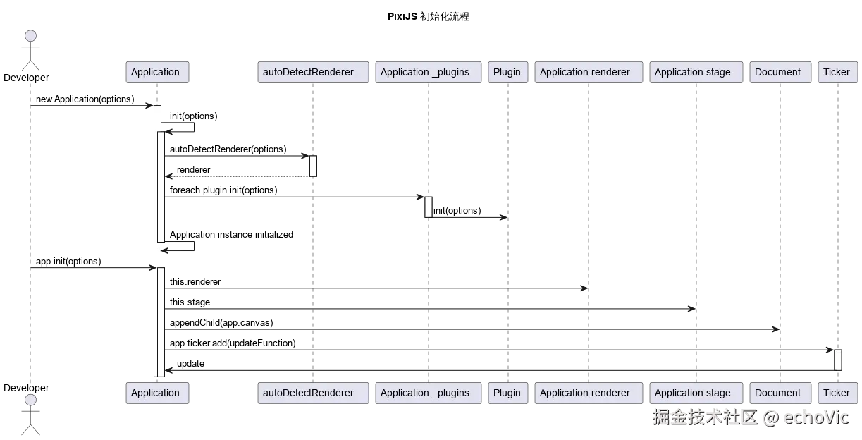 Application 类的启动过程由init()方法控制,该方法用于初始化渲染器、场景图和其他必要组件。默认情况下,autoStart选项为true,这意味着在初始化之后会自动启动 Ticker。