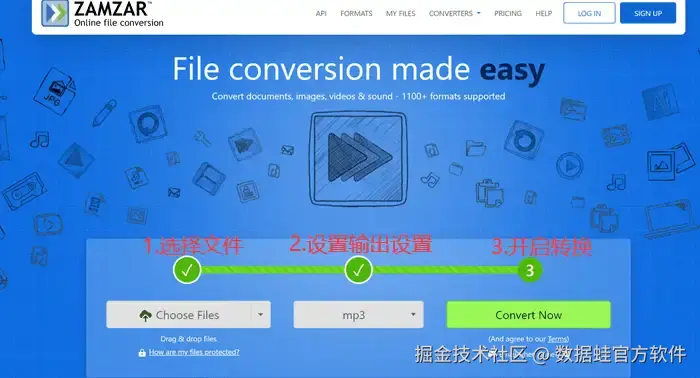 注意:虽然Zamzar可以快速转换文件,但转换后的文件质量可能不如原始文件,音频会受到压缩和损坏。Zamzar可以免费使用,但免费转换的次数有限。如果需要转换大量文件,需要考虑购买高级服务或寻找其他解决方案。