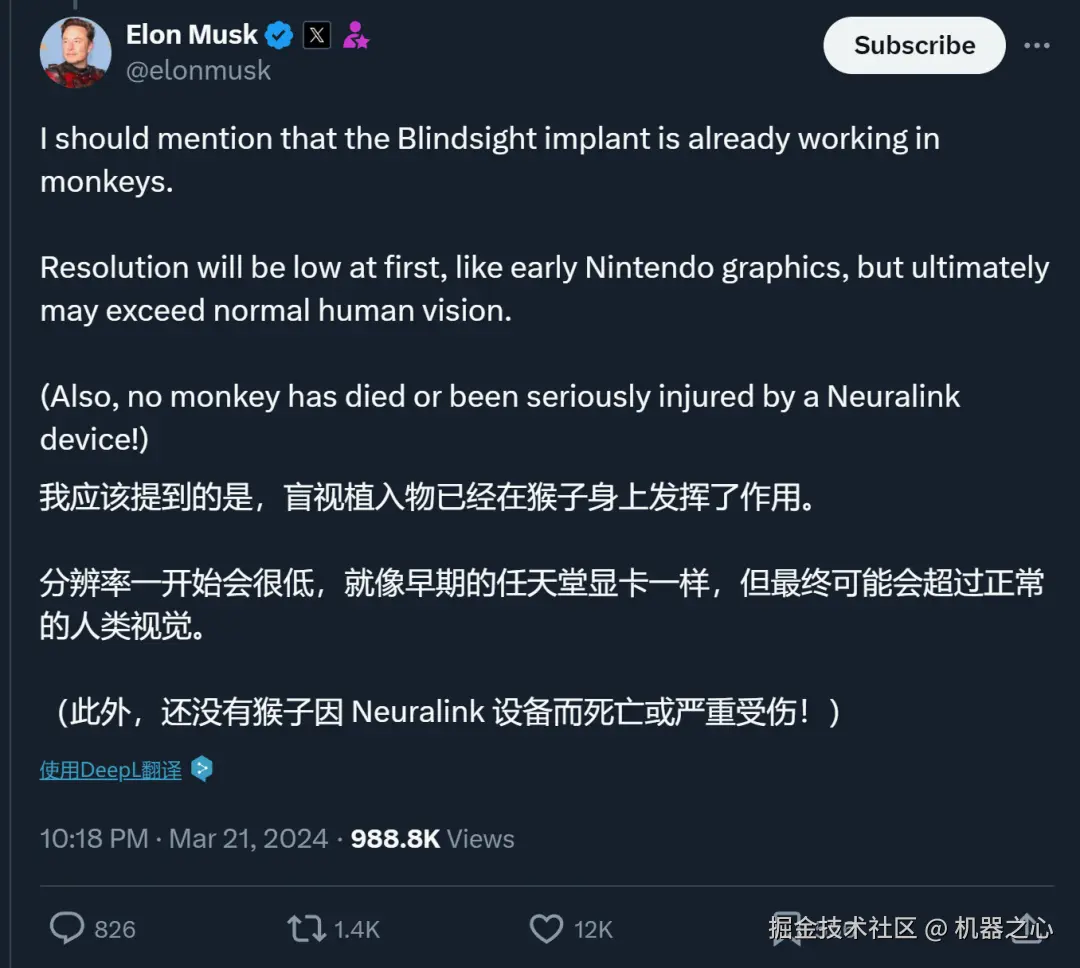 在 3 月份的一则推文中,马斯克还提到,Blindsight 植入物已经在猴子身上发挥了作用。