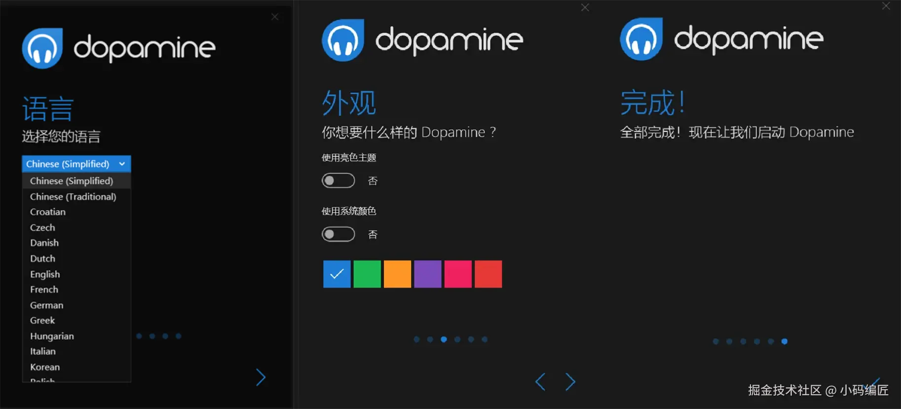 首次启动时,它会让我们选择主题颜色、显示语言、库文件(音乐文件所在的目录)。