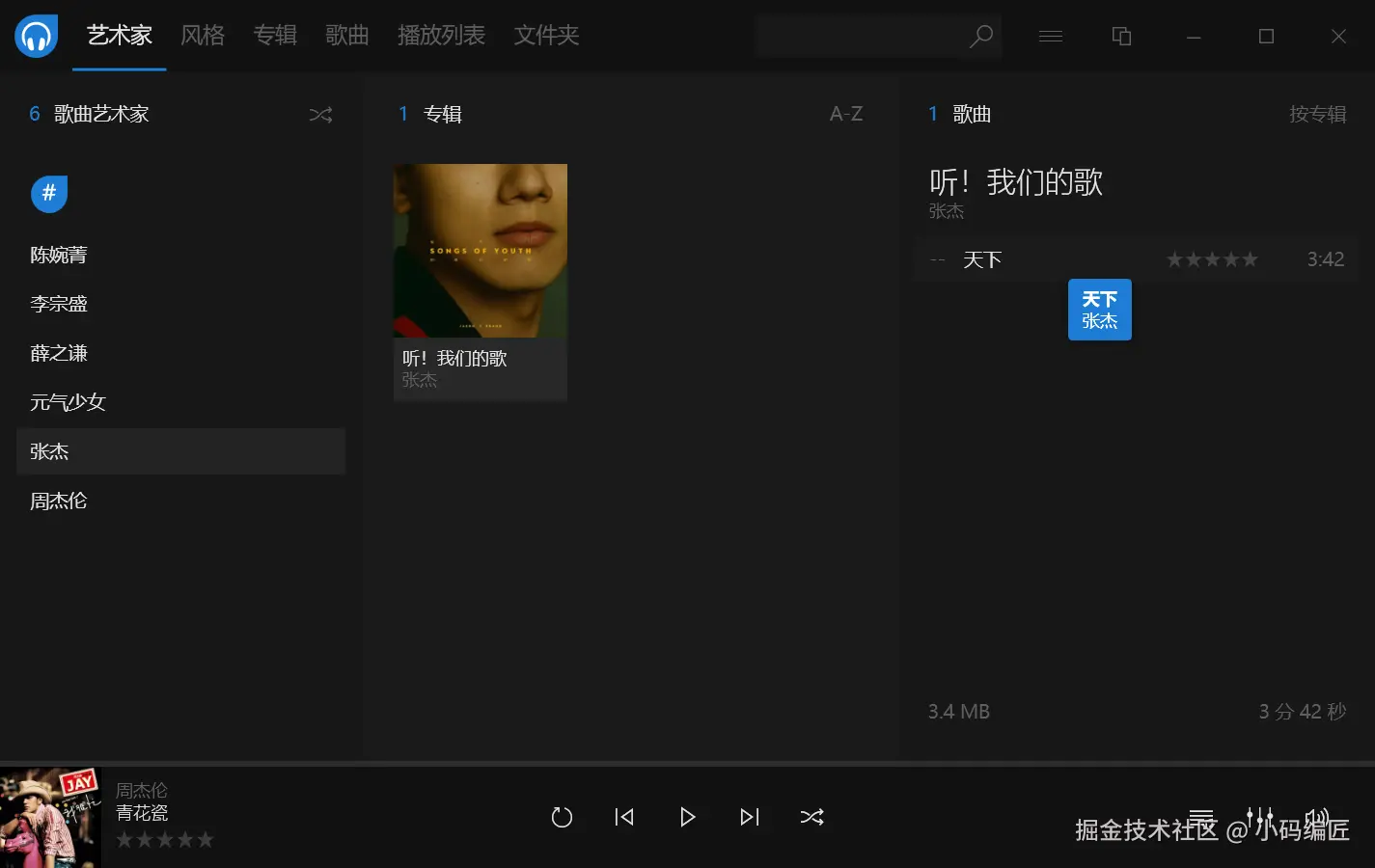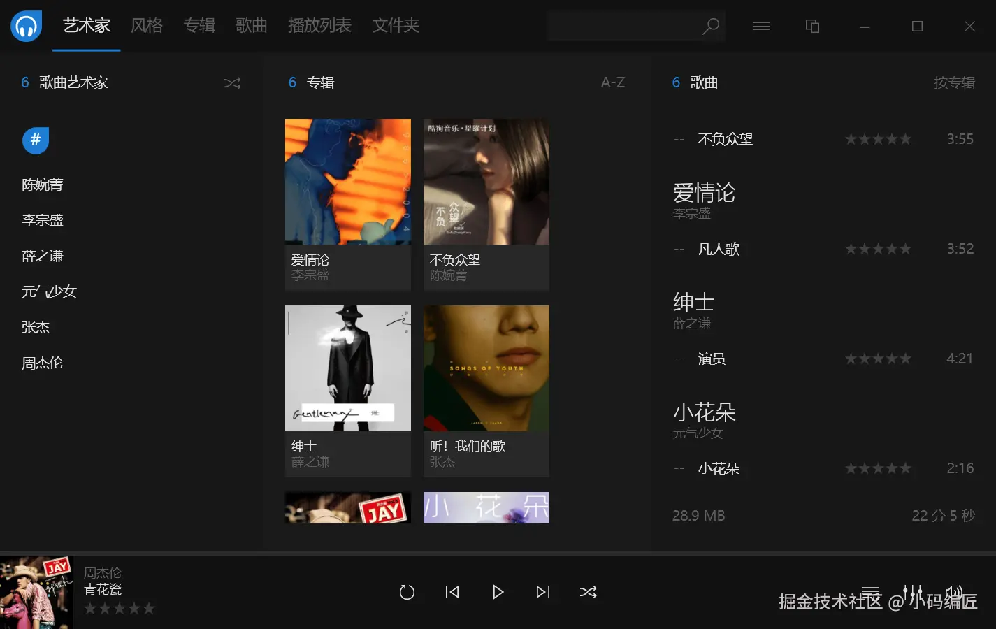 Dopamine 是一款简单好用的、功能强大的、完全免费且无广告的本地音乐播放器。它有绿色便携版(30MB)和可安装版(34MB),目前仅支持 Windows 平台。