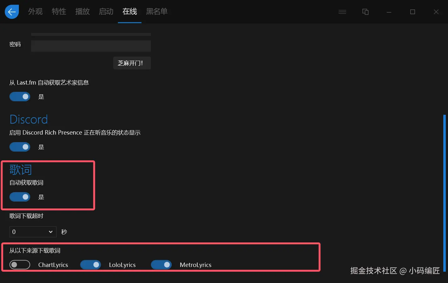 它支持歌词滚动,既可以导入本地歌词文件,也支持从网易云、虾米音乐ChartLyrics、LoloLyrics 和 MetroLyrics 等平台自动获取歌词。