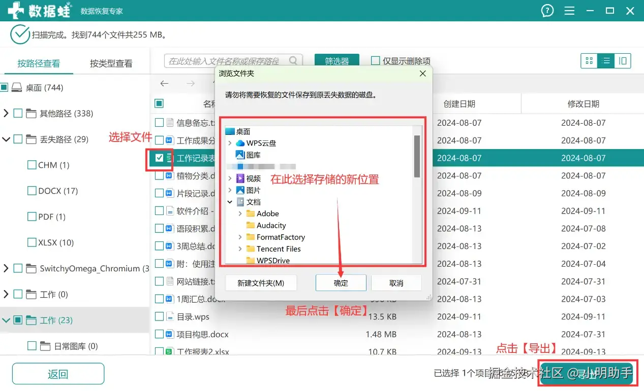 步骤3: 选中文件后点击【导出】,在弹窗选择文件的存储新位置完成移动硬盘数据恢复。