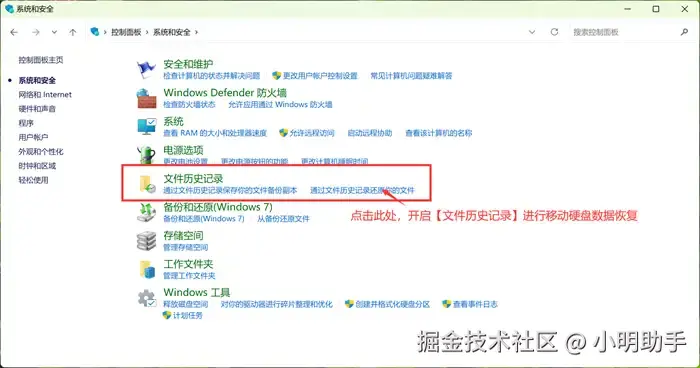 找到【控制面板】,点击【系统与安全】后就能找到【文件历史记录】;点进去后找到丢失文件后点击【还原】。