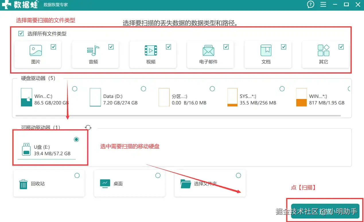 步骤1: 在软件的主页面选择需要恢复的文件类型,在把移动硬盘和电脑连接后,在可移动驱动器里选择移动硬盘的图标,作为扫描位置。然后点击【扫描】。