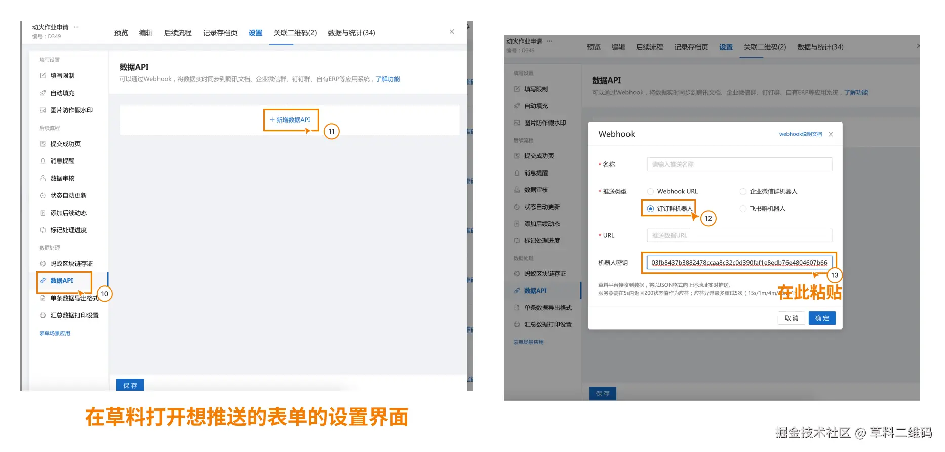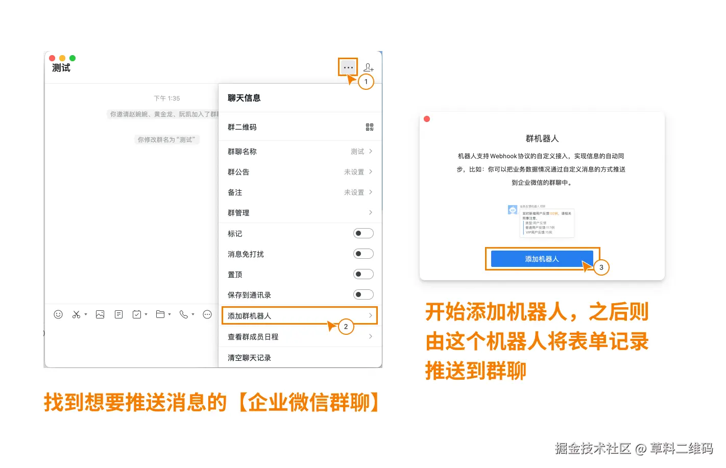 如何将扫码提交的数据直接推送到企业微信、钉钉、飞书群聊?详细教程 草料二维码 2024-09-18 148 阅读1分钟 功能介绍 在草料制作的表单中,填表人扫码填写并提交数据后,这些信息可以立即通过企业微信、钉钉或飞书自动推送到相应的群聊中,实现即时共享和沟通,提升团队协作效率。 设置教程 企业微信 钉钉 飞书