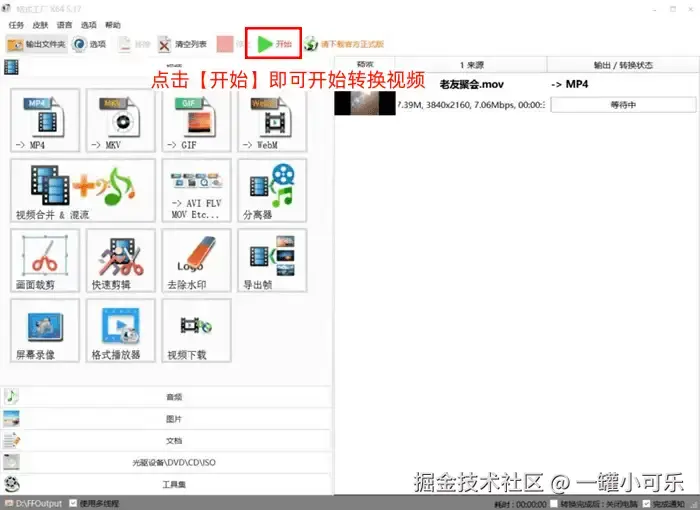 步骤3:在等待格式转换界面中,点击界面上方的 【开始】 标志,即可开始转换视频格式。