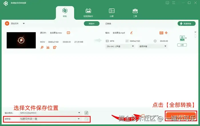 步骤3:点击 【保存至】 选项,选择文件输出的保存位置,然后点击 【全部转换】 ,等待视频格式转换完成即可。