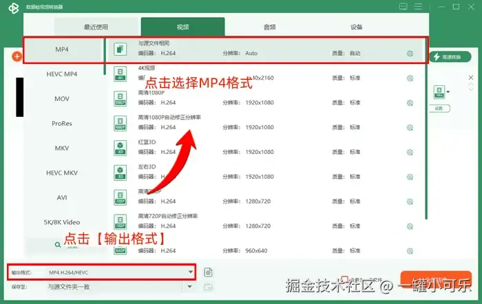 步骤2:文件导入之后,选择 【输出格式】 ,在其弹出的选择界面中,点击 【MP4】 格式选项。