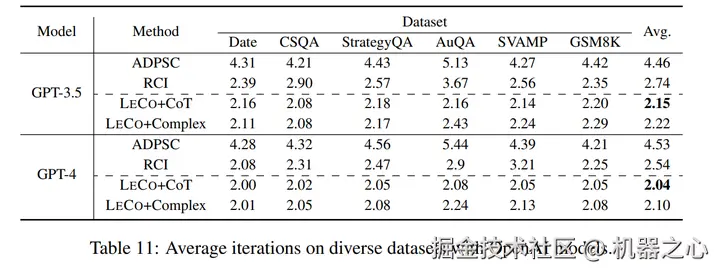 LeCo 的效率提升:如下两个表格所示,LeCo 除了在各种任务上对性能有一定提升之外,所消耗的 token 数量更少(如:比 self-consistency 低 80%),并且所需的迭代轮数更低。