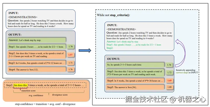 一句话总结:LeCo 通过大模型自己生成的推理步骤进行自我纠正,无需人类反馈,手工提示和外部工具。其核心思想就是:模型如果知道更多的正确推理步骤,那他的搜索空间就可以压缩,从而更有高效地找到完整的正确推理路径。LeCo 为每个推理步骤计算置信度分数,通过分数给推理步骤打分,低分的推理步被视为潜在错误,之前的步骤被视为正确。通过将这些正确步骤附加到输入中,模型可以逐步接近正确答案。如下图所示,LeCo 首先得到对当前问题的解(左边 output), 然后我们逐渐去收集正确的推理步骤知道得到最后正确的解。这种渐进式学习方法不仅提高了推理准确性,还减少了 tokens 消耗(穷人友好)和迭代次数(和投票,从错误中学习相比)。