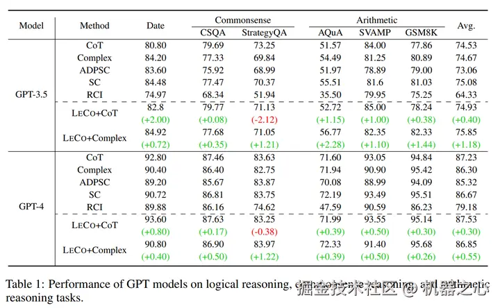 表 1:LeCo 在逻辑,常识和数学推理上面的性能表现