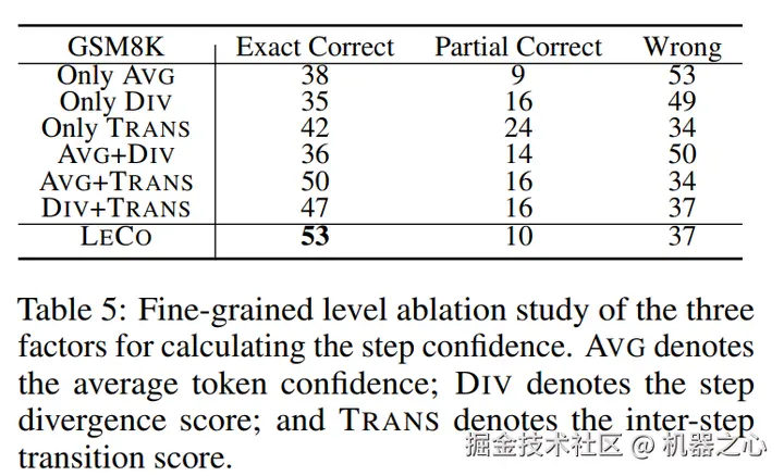 人工分析:为了进一步验证 LeCo 是否真的能识别到推理中正确的步骤,本文人工标注了 100 题 GSM8K,找出推理过程中正确和错误的时间步。Exact Correct 表示 LeCo 能精确定位到第一步犯错的步骤,Partial Correct 表示定位在 1 步的误差范围内,Wrong 表示定位误差范围大于 1 步。总体来说,LeCo 可以通过计算置信度的方式而无需外部信息较为准备地找出正确和错误的步骤,不过仍然存在提升空间。