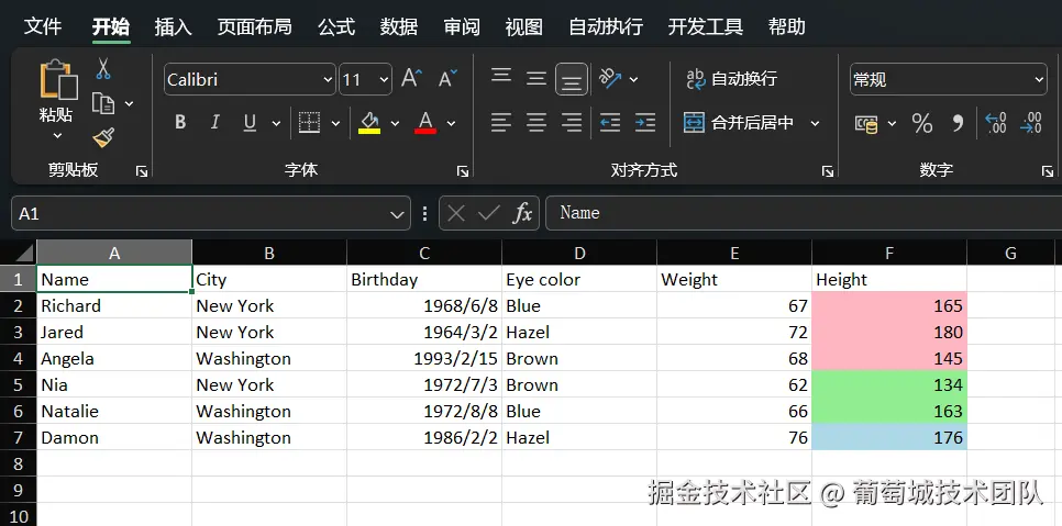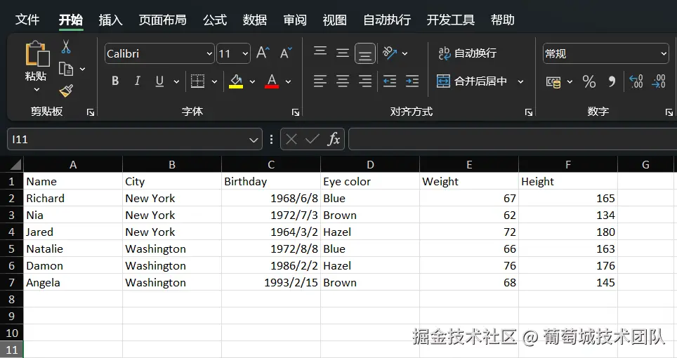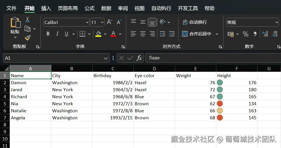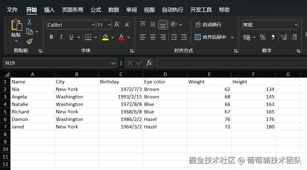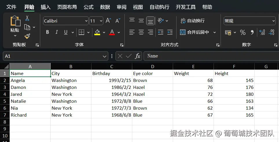{"Name", "City", "Birthday", "Eye color", "Weight", "Height"},