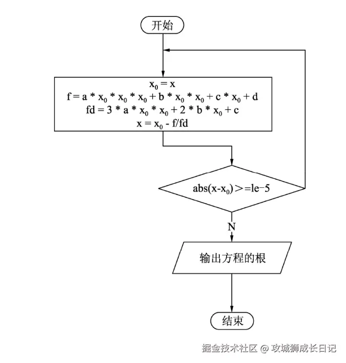 编写程序时要注意的一点是判定|x-x0|>=1e-5,许多初学者认为判定条件应该是|x-x0|<1e-5,从牛顿迭代法的原理可以看出,迭代的实质就是越来越接近方程根的精确值,最初给x0