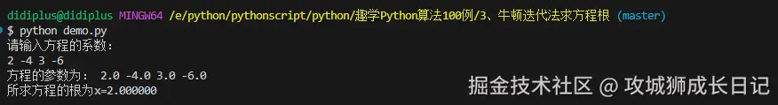 x0代入方程中计算此时的f(x0 )及f'(x0 );程序中用变量f描述方程的值,用fd描述方程求导之后的值。 - 计算增量