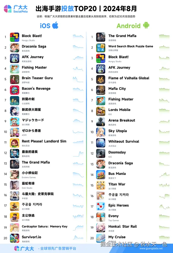 广大大发布最新2024年8月出海成功手游TOP20榜单。