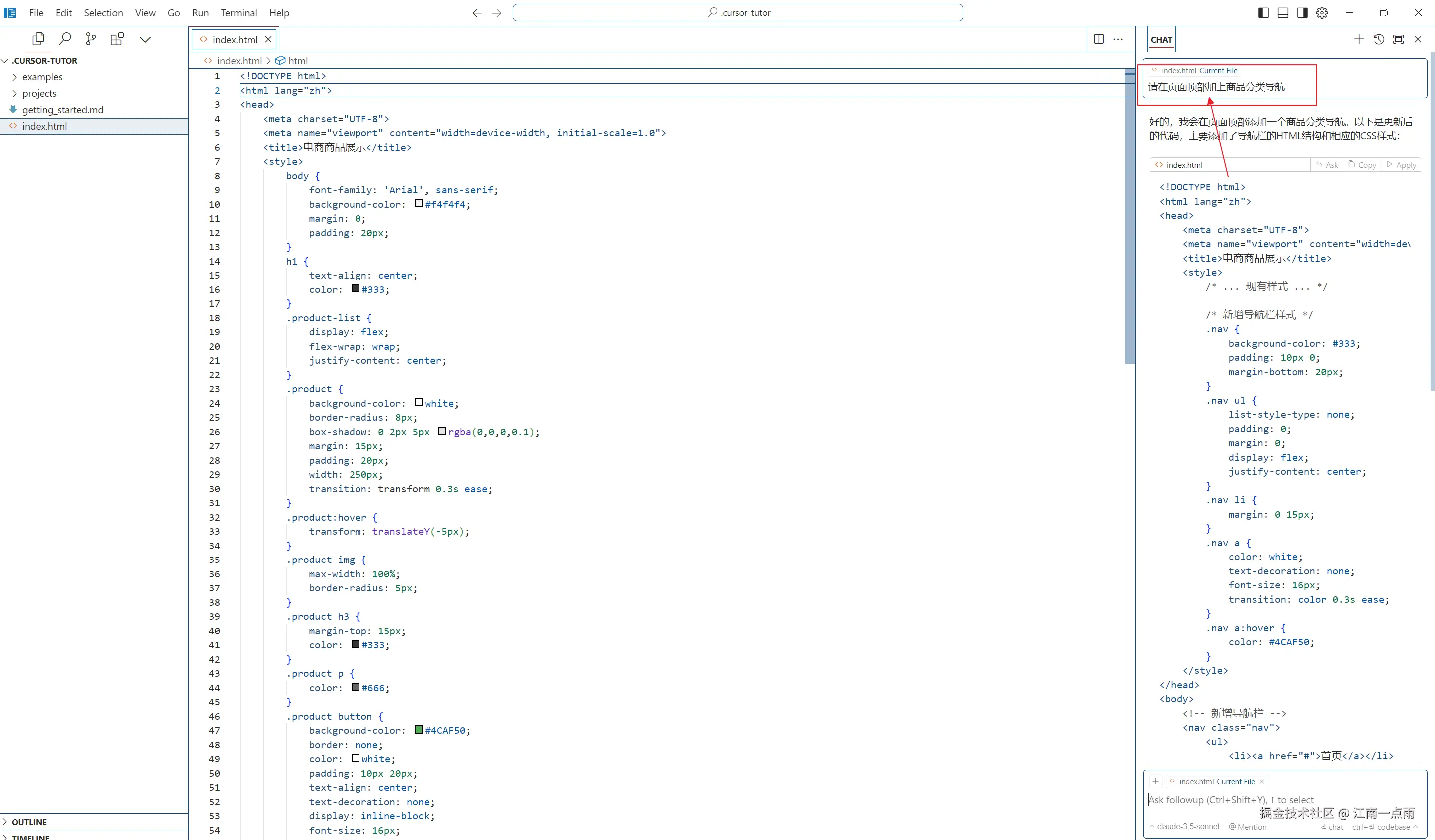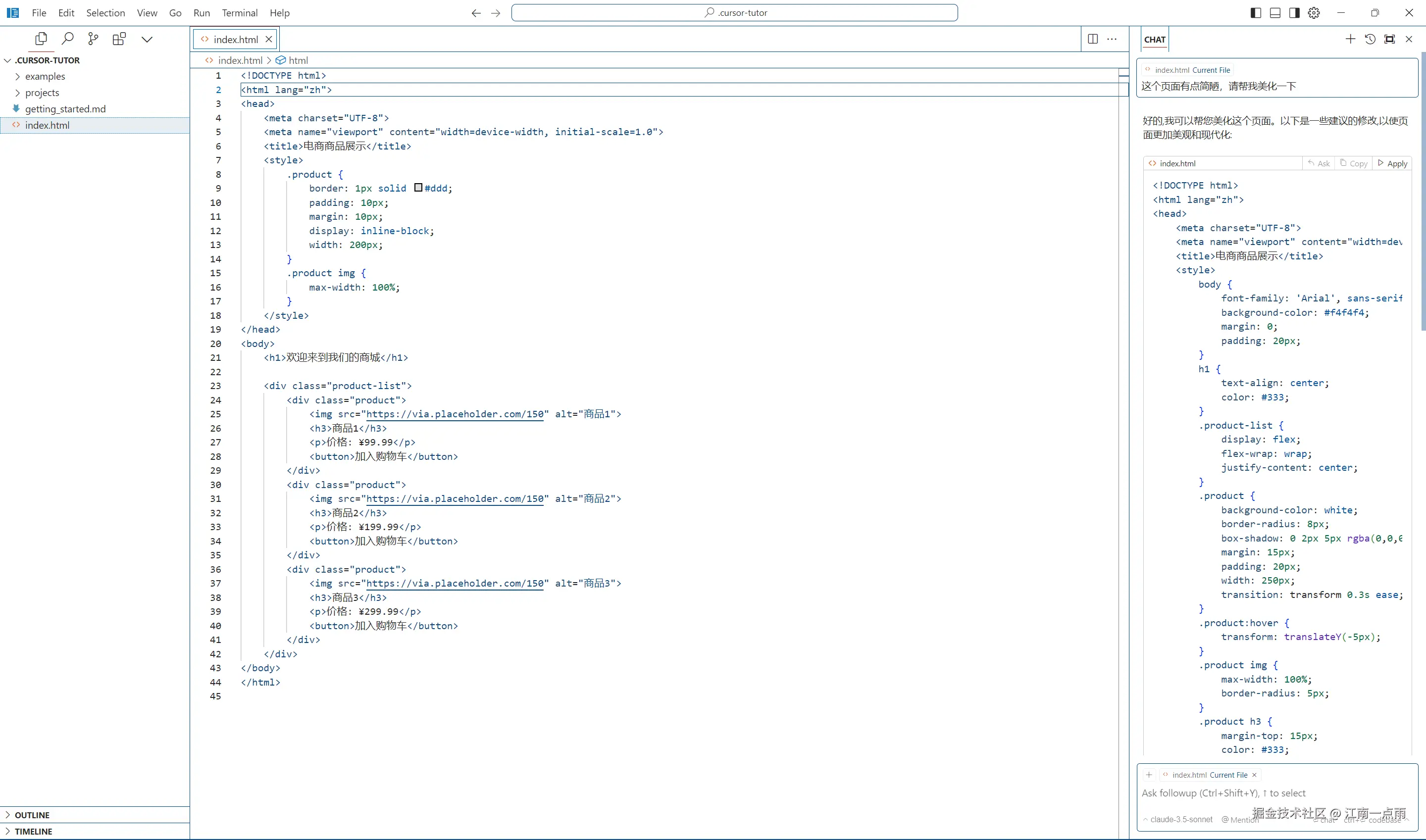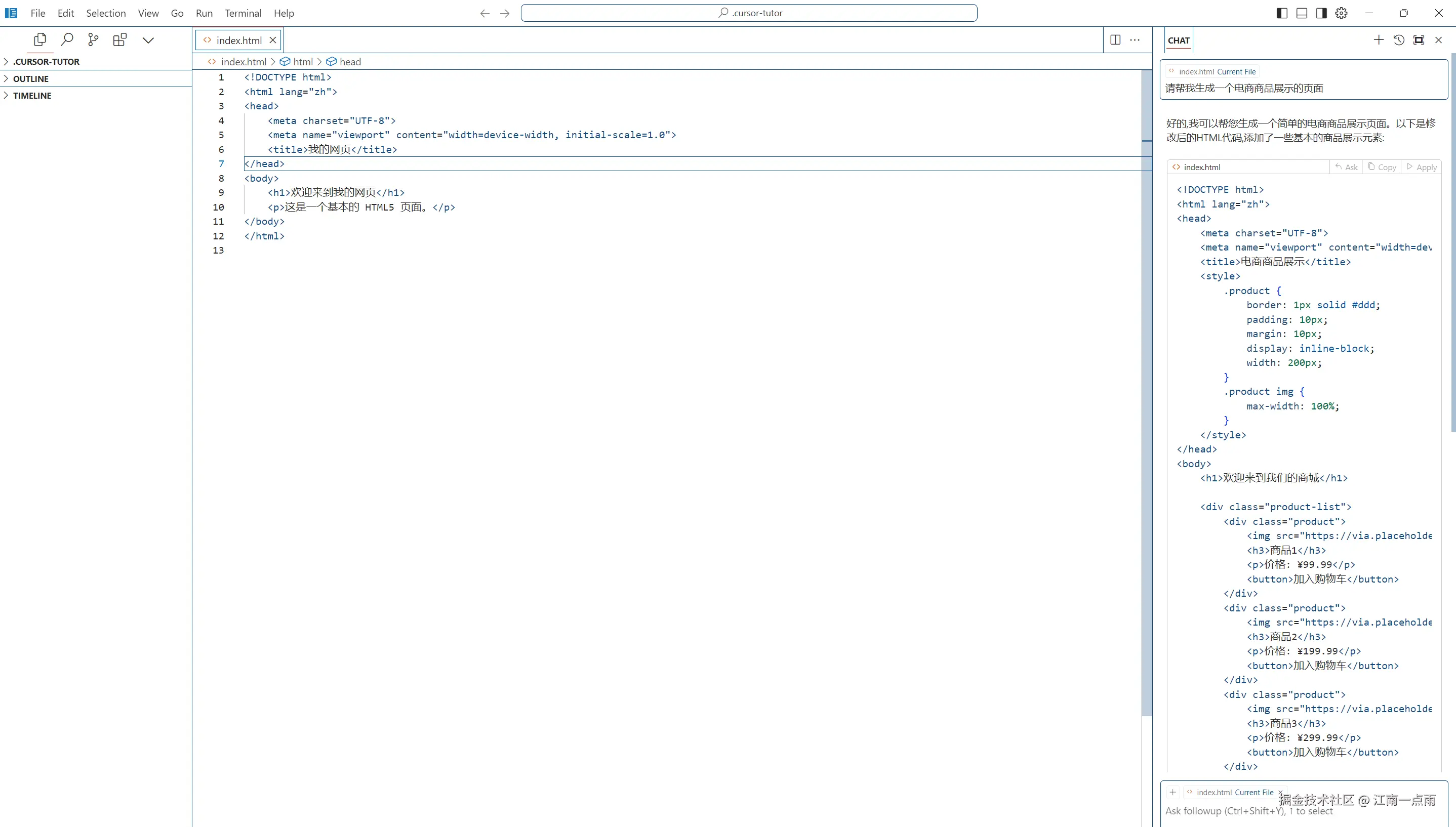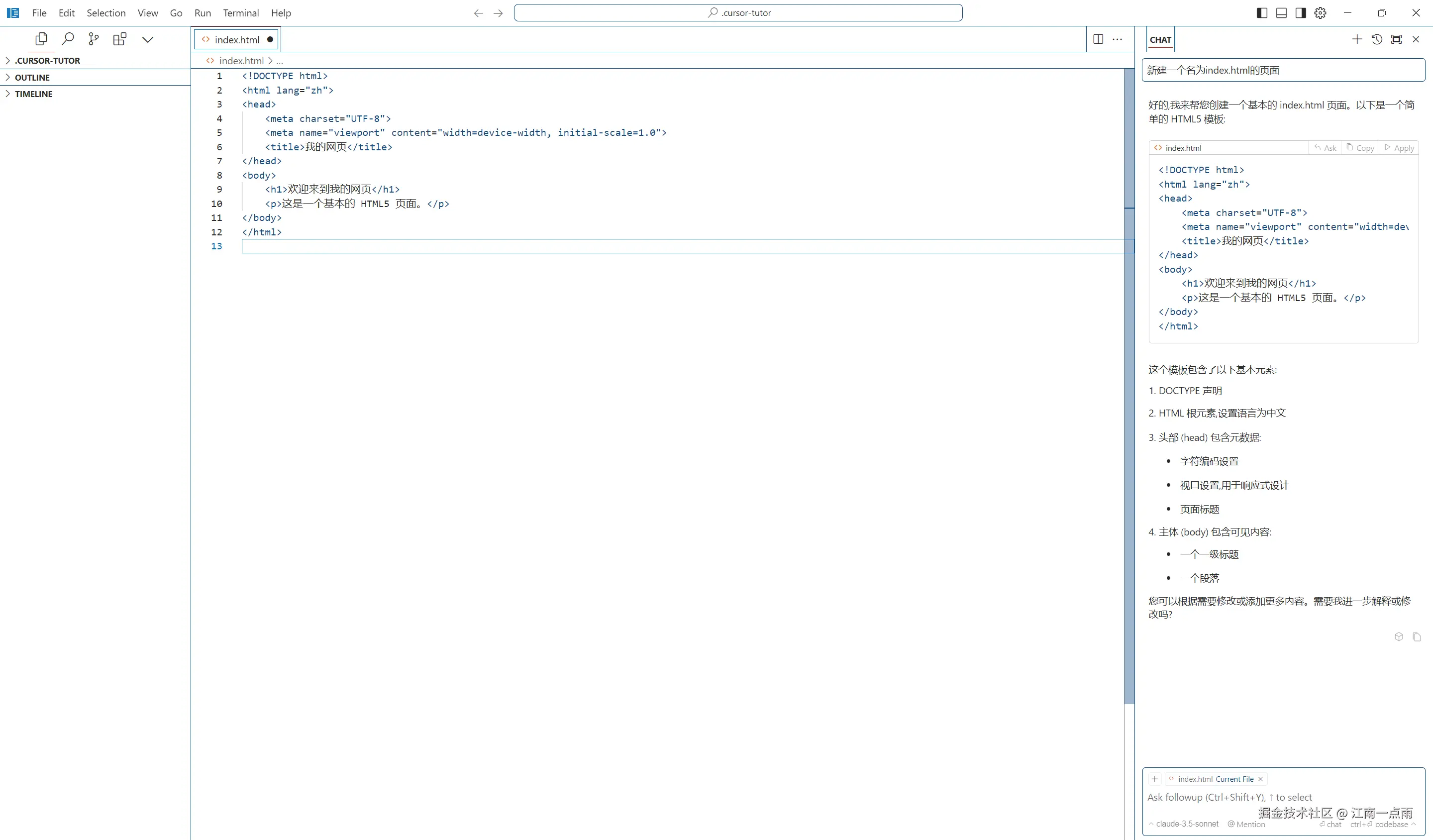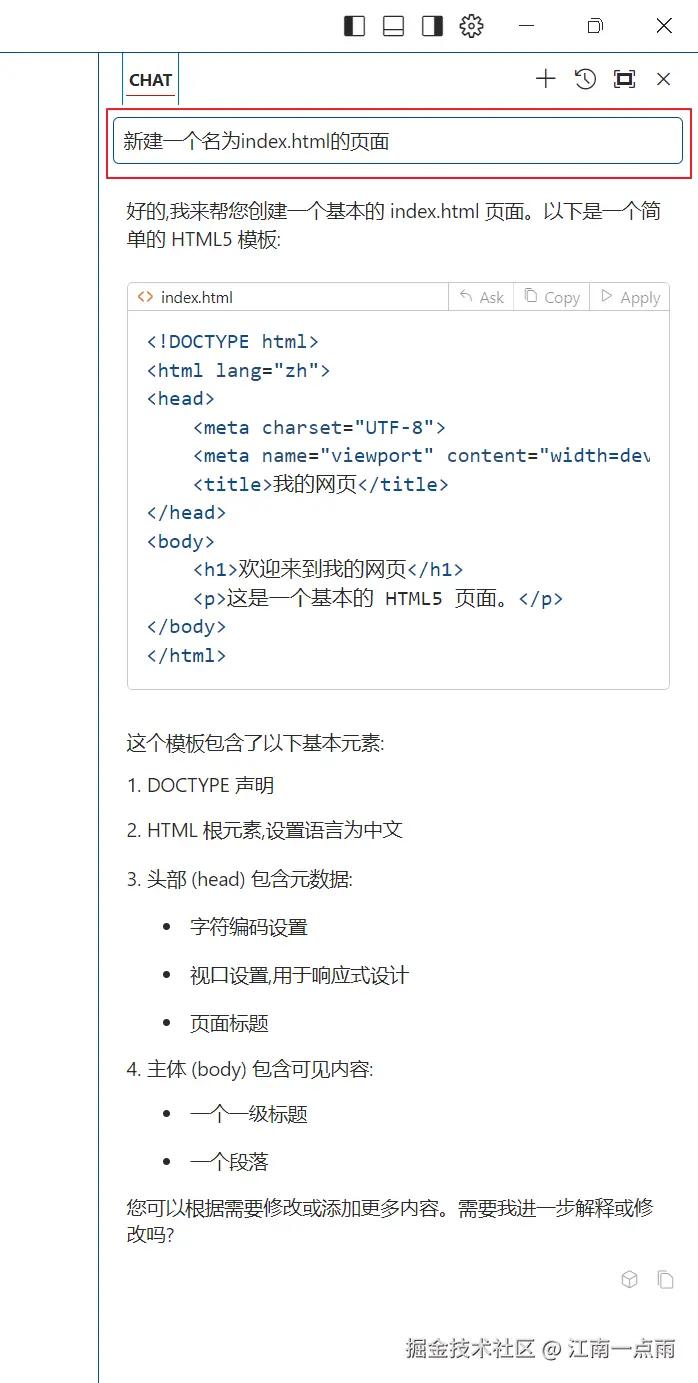 首先我们按 Ctrl+L 可以唤出 AI 对话页面,然后让 AI 帮我们新建一个 index.html 页面,如下图: