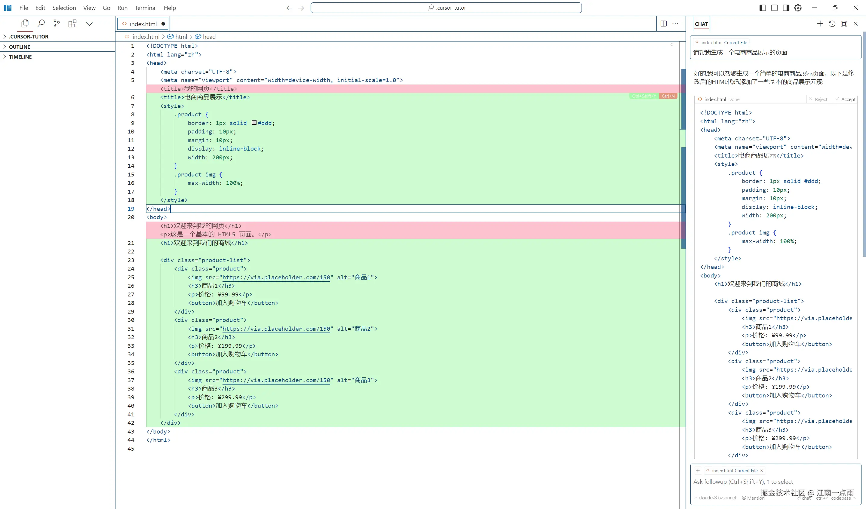 生成之后,继续点击 Apply 和 Accept 按钮,工具会自动进行代码比对,将生成的代码插入到我们的 index.html 文件中: