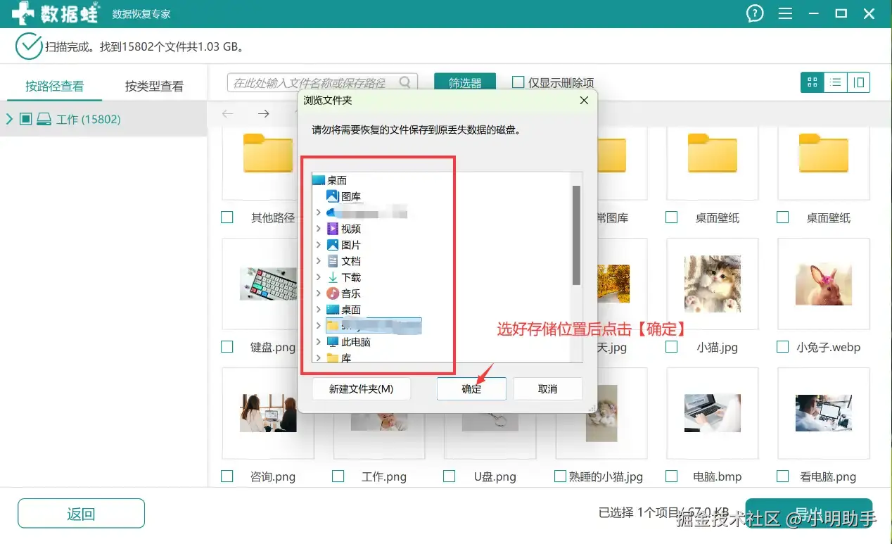 步骤3: 点击【导出】后会弹出一个窗口,在上面为恢复文件选择另一个存储位置。