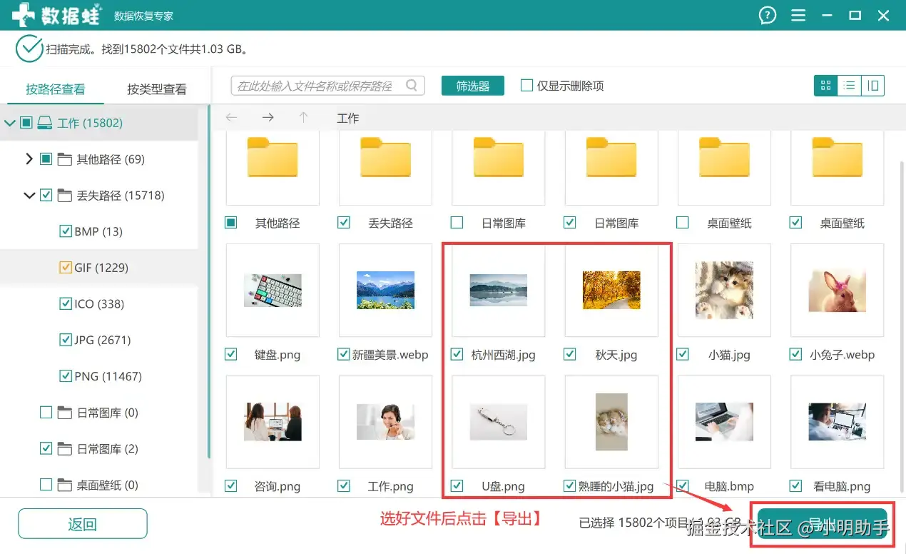 步骤2: 等待软件的扫描结束,勾选出自己需要恢复的文件,点击【导出】。