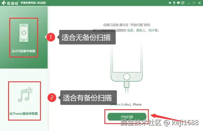 步骤1:启动苹果恢复专家,使用USB数据线将iPhone连接到电脑,在软件识别到设备后,选择合适的扫描方式并点击 【开始扫描】 。