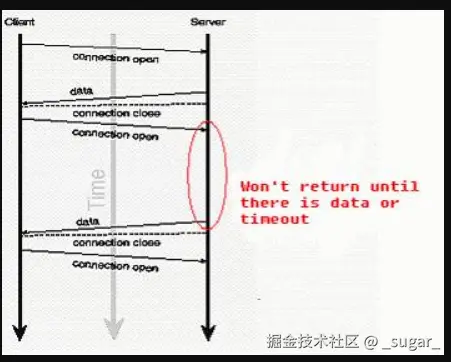 这种方式是客户端发送一个请求到服务器,服务器查看客户端请求的数据是否发生了变化(是否有最新数据),如果发生变化则立即响应返回,否则保持这个连接并定期检查最新数据(服务器端阻塞请求),直到发生了数据更新或连接超时。同时客户端连接一旦成功接收到数据之后,立刻发出请求,这样在相同时间内大大减少了客户端请求服务器的次数。