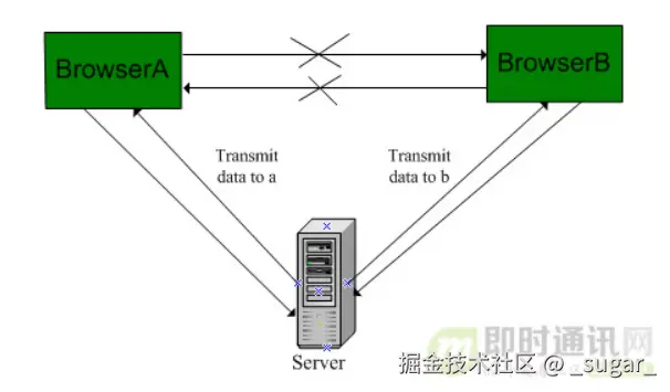 浏览器从诞生开始一直走的是客户端请求服务器,服务器返回结果的模式,即使发展至今仍然没有任何改变。所以可以肯定的是,要想实现两个客户端的通信,必然要通过服务器进行信息的转发。例如A要和B通信,则应该是A先把信息发送给IM应用服务器,服务器根据A信息中携带的接收者将它再转发给B,同样B到A也是这种模式