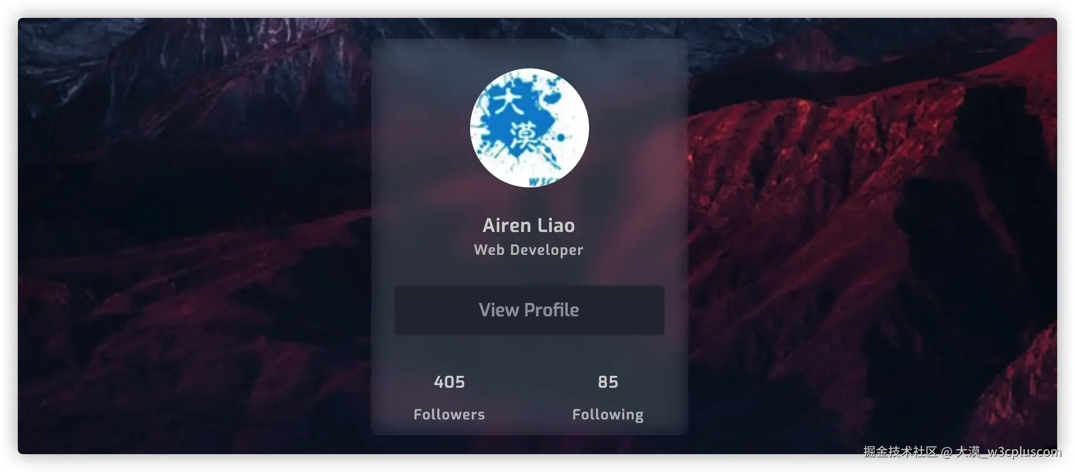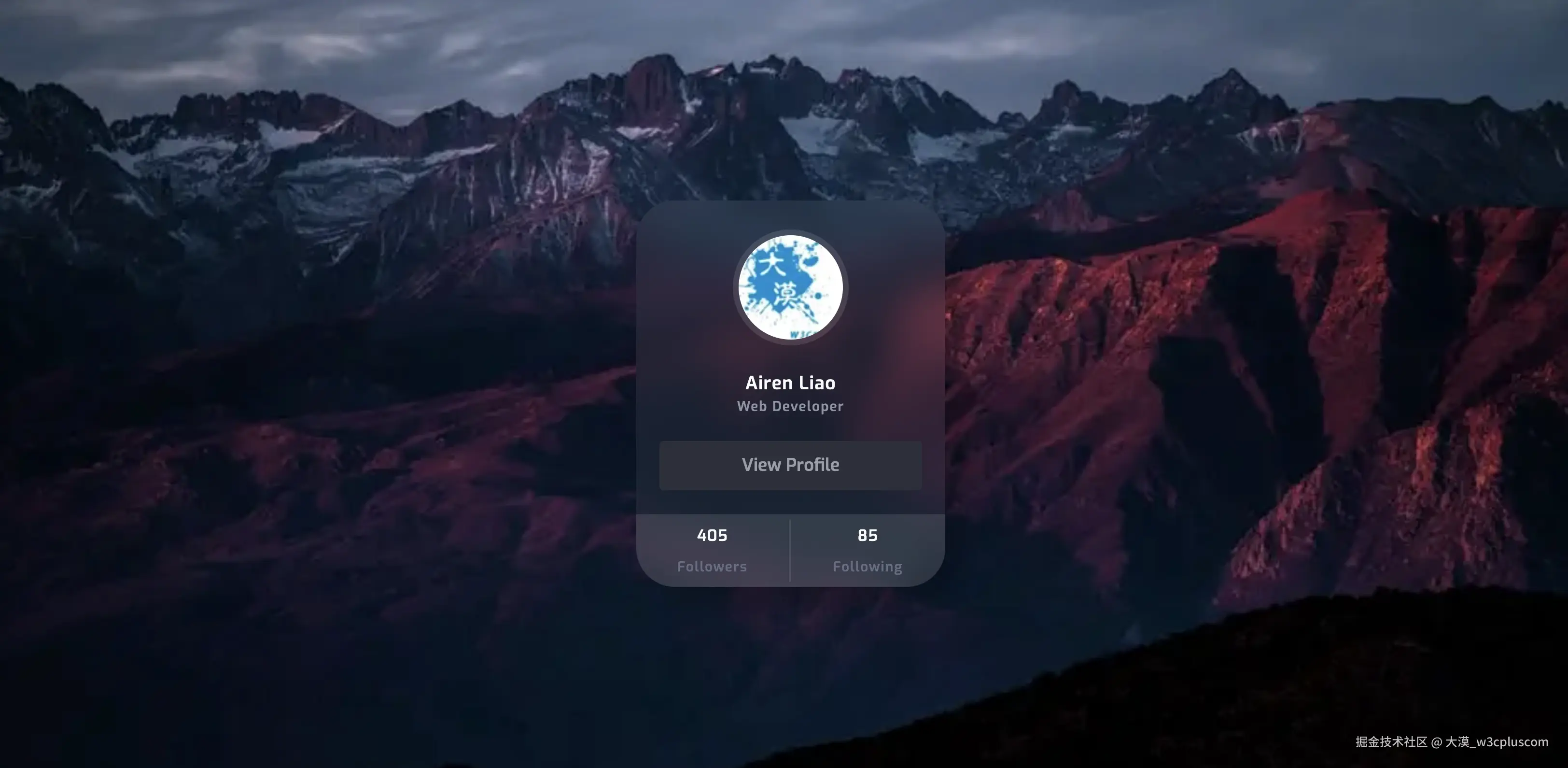 磨砂玻璃的效果关键处是背景和内容层之间有一个模糊层,就我们的示例而言,就是.card自己具有一个模糊背景效果。在CSS中我们可以使用filter来构建模糊效果: