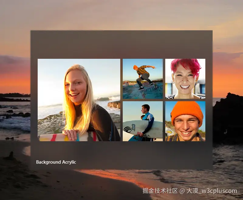 这种效果在微软的Fluent设计系统中也很受重视,并且将这种效果称之为“亚克力(Acrylic Material)”效果,并将该效果做为Fluent设计系统中的一个组件。